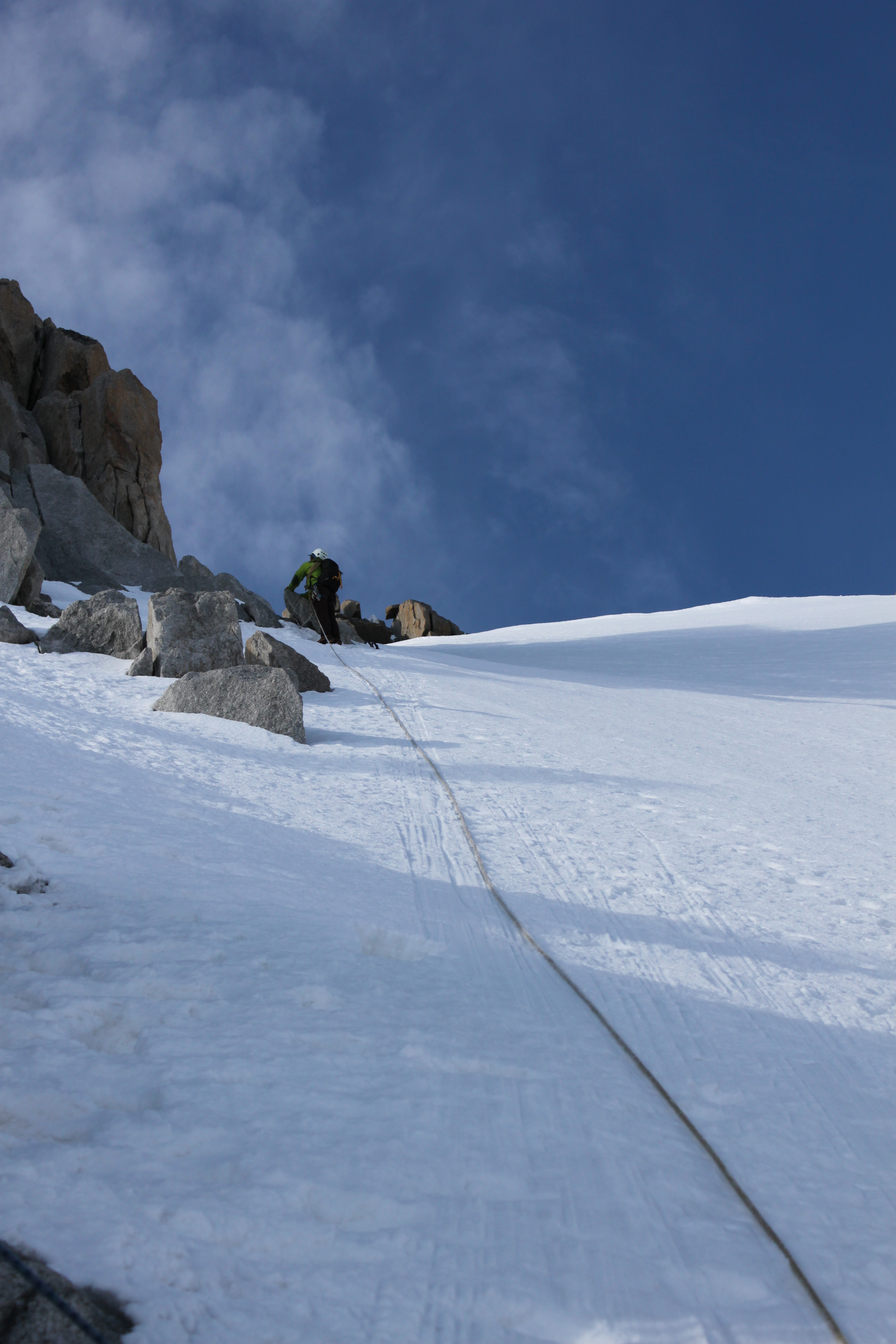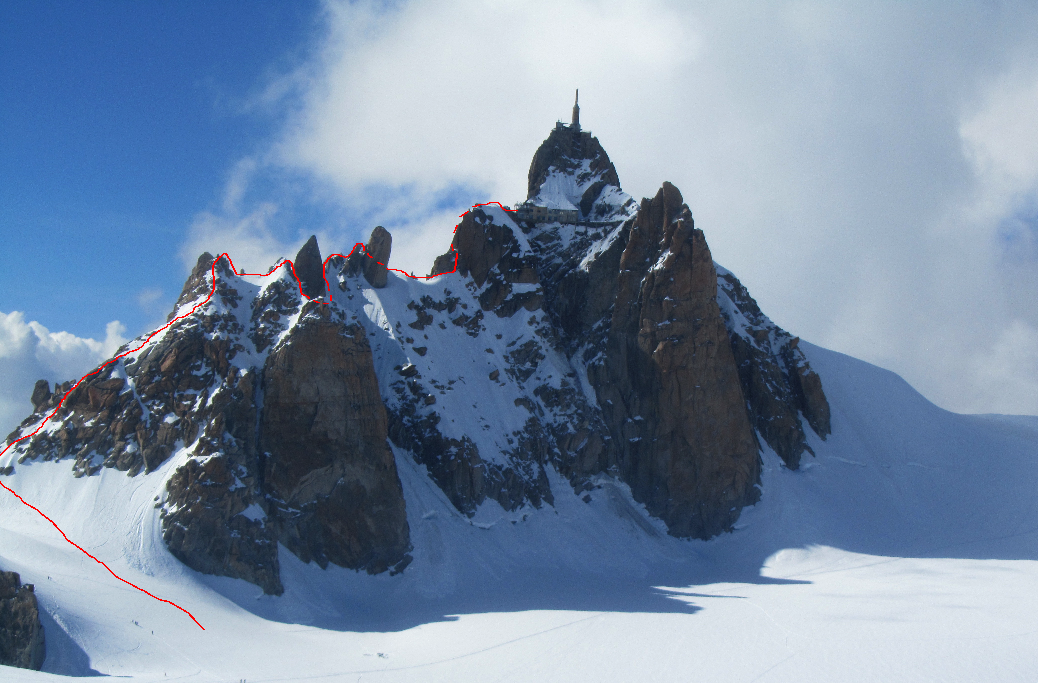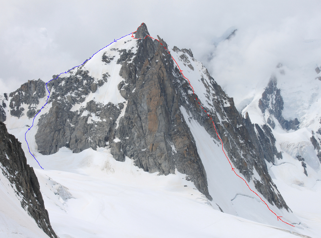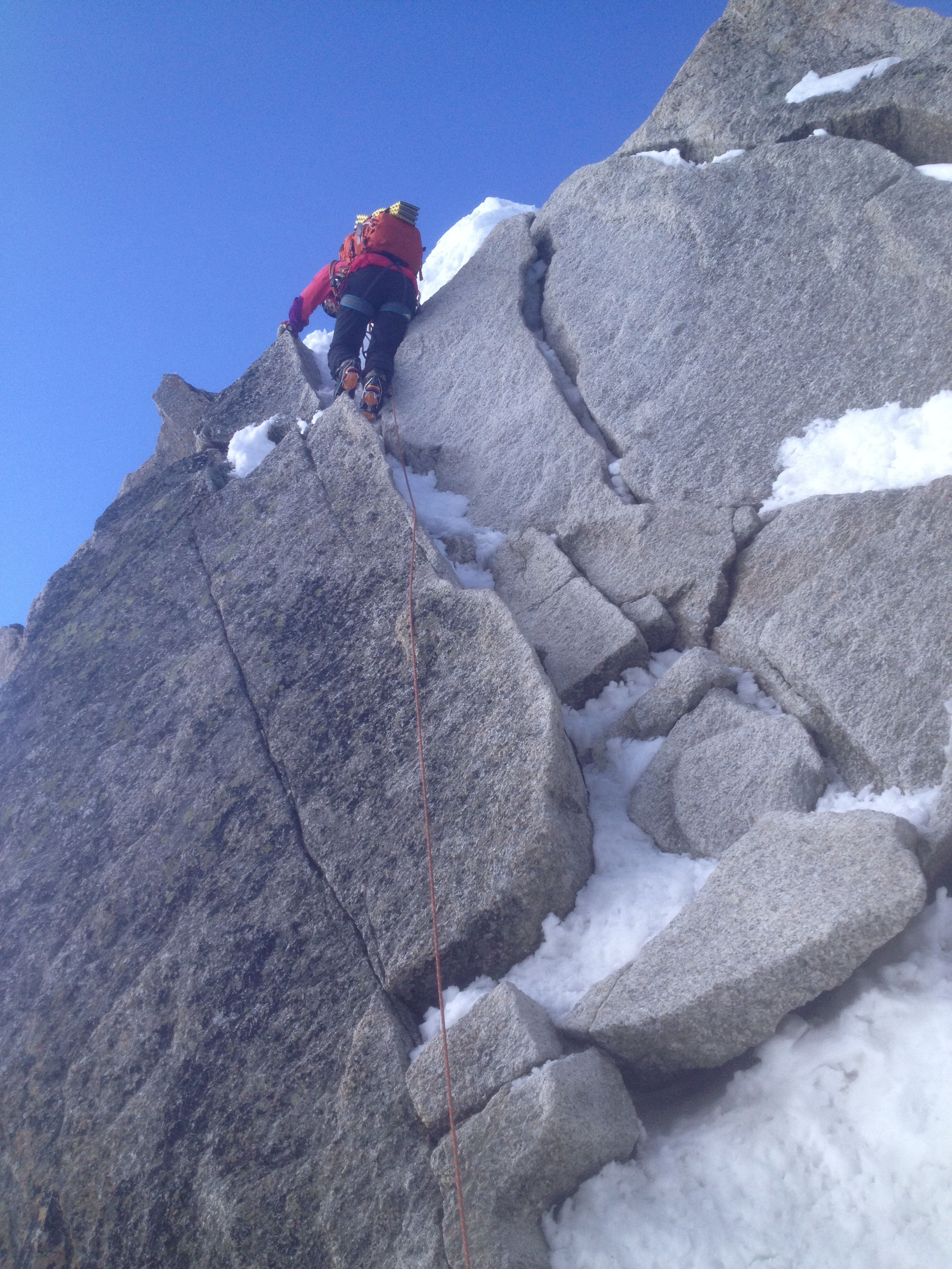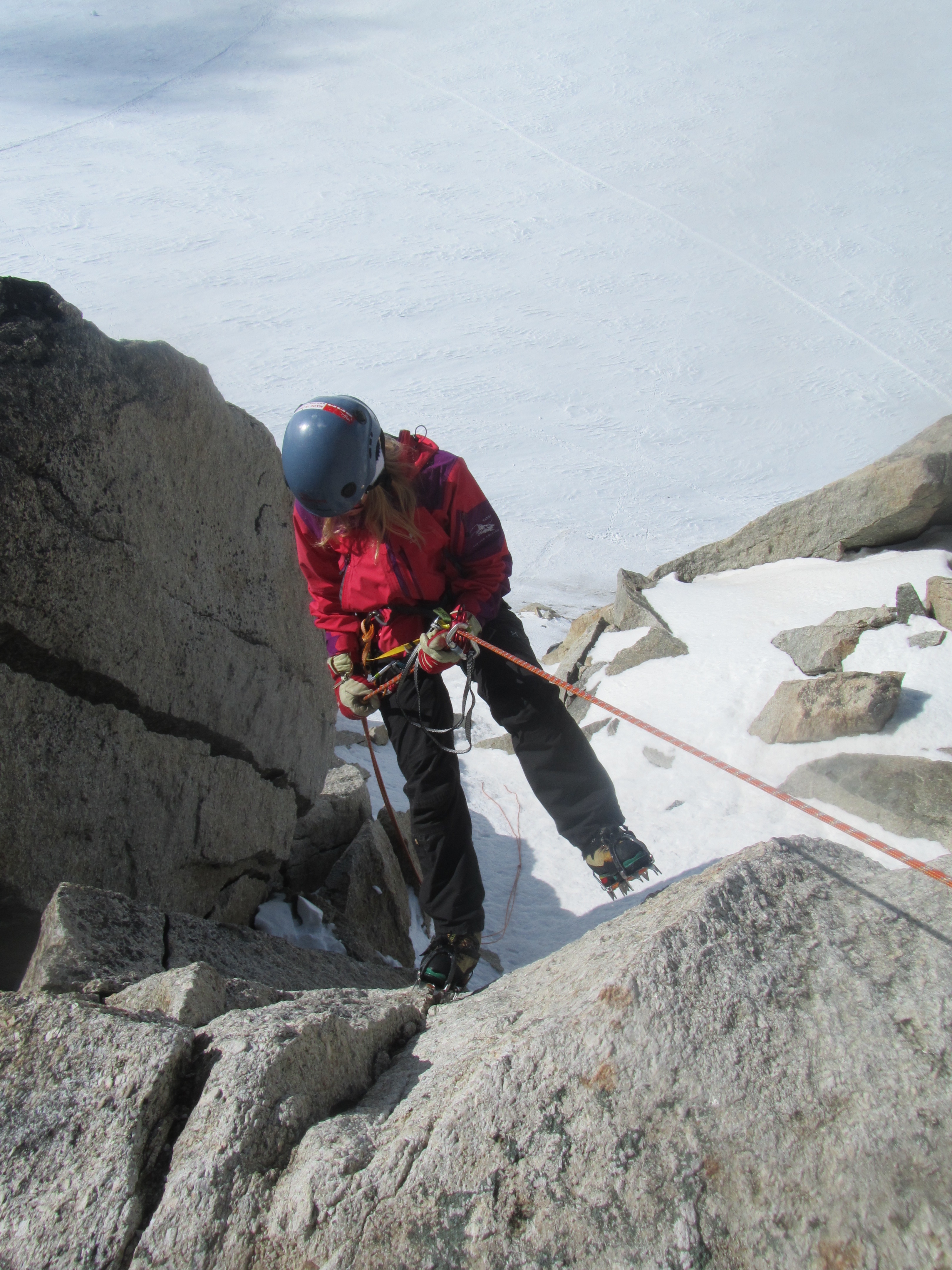 The route starts up the left hand ridge and follows the ridge towards the Tacul Triangle, there is a snow ridge followed by a small scramble then a short 20m rappel before you cross the second snow ridge which was more exposed.