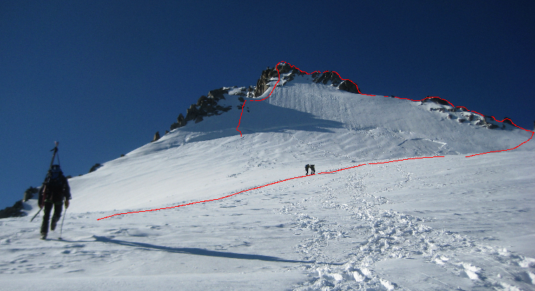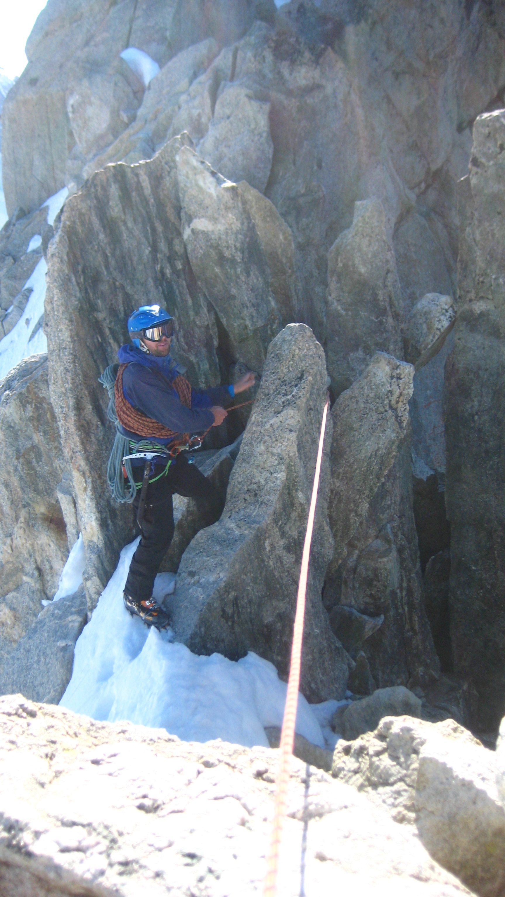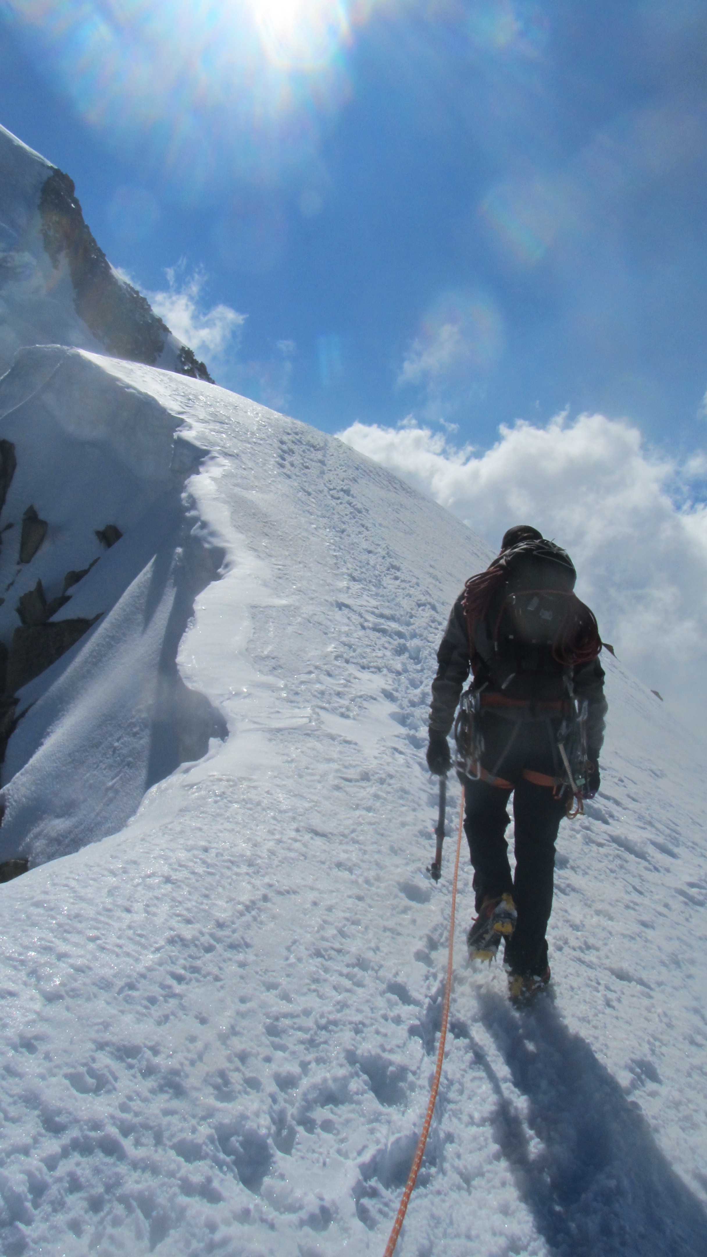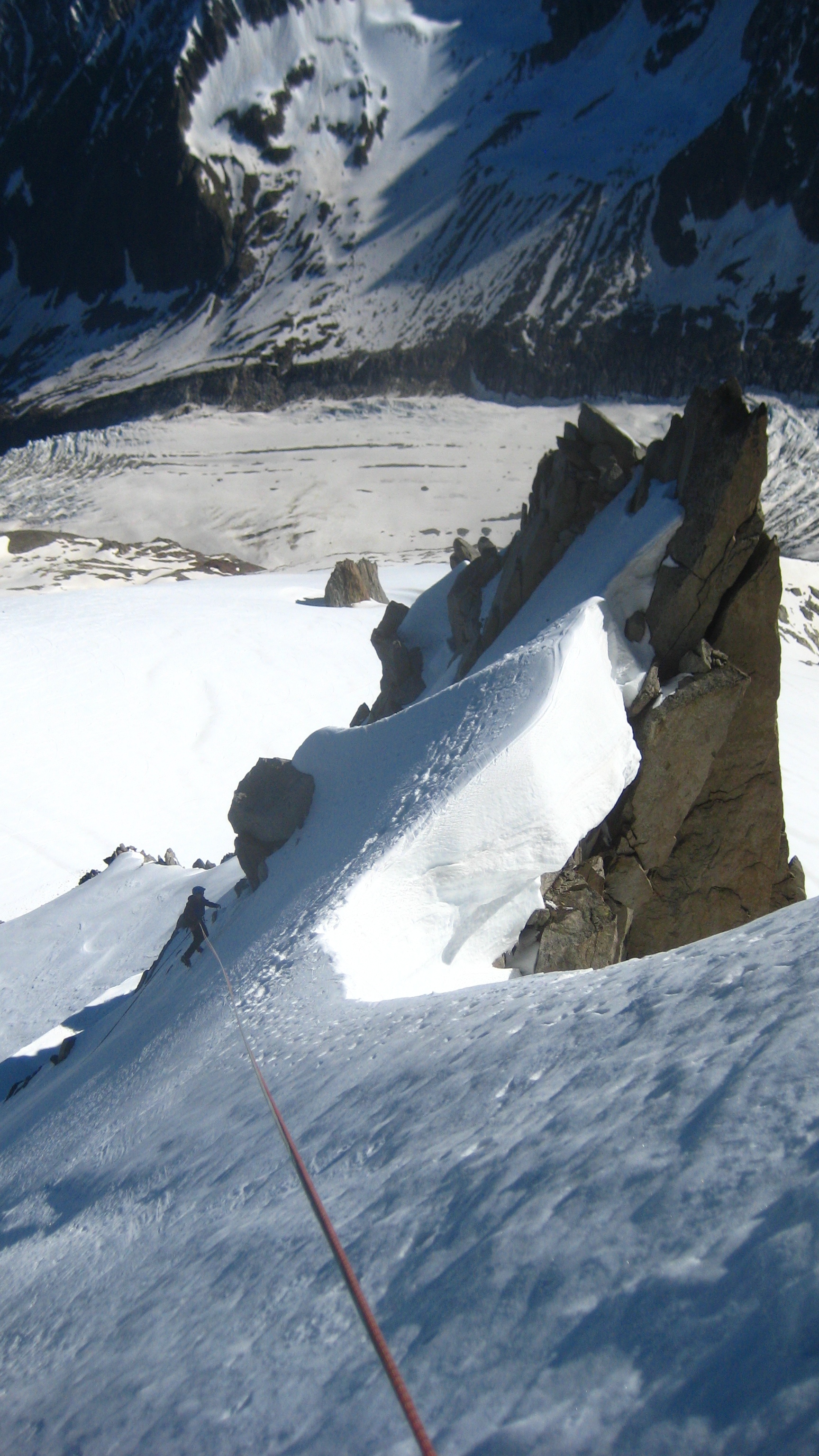 The route starts up the left hand ridge and follows the ridge towards the Tacul Triangle, there is a snow ridge followed by a small scramble then a short 20m rappel before you cross the second snow ridge which was more exposed.