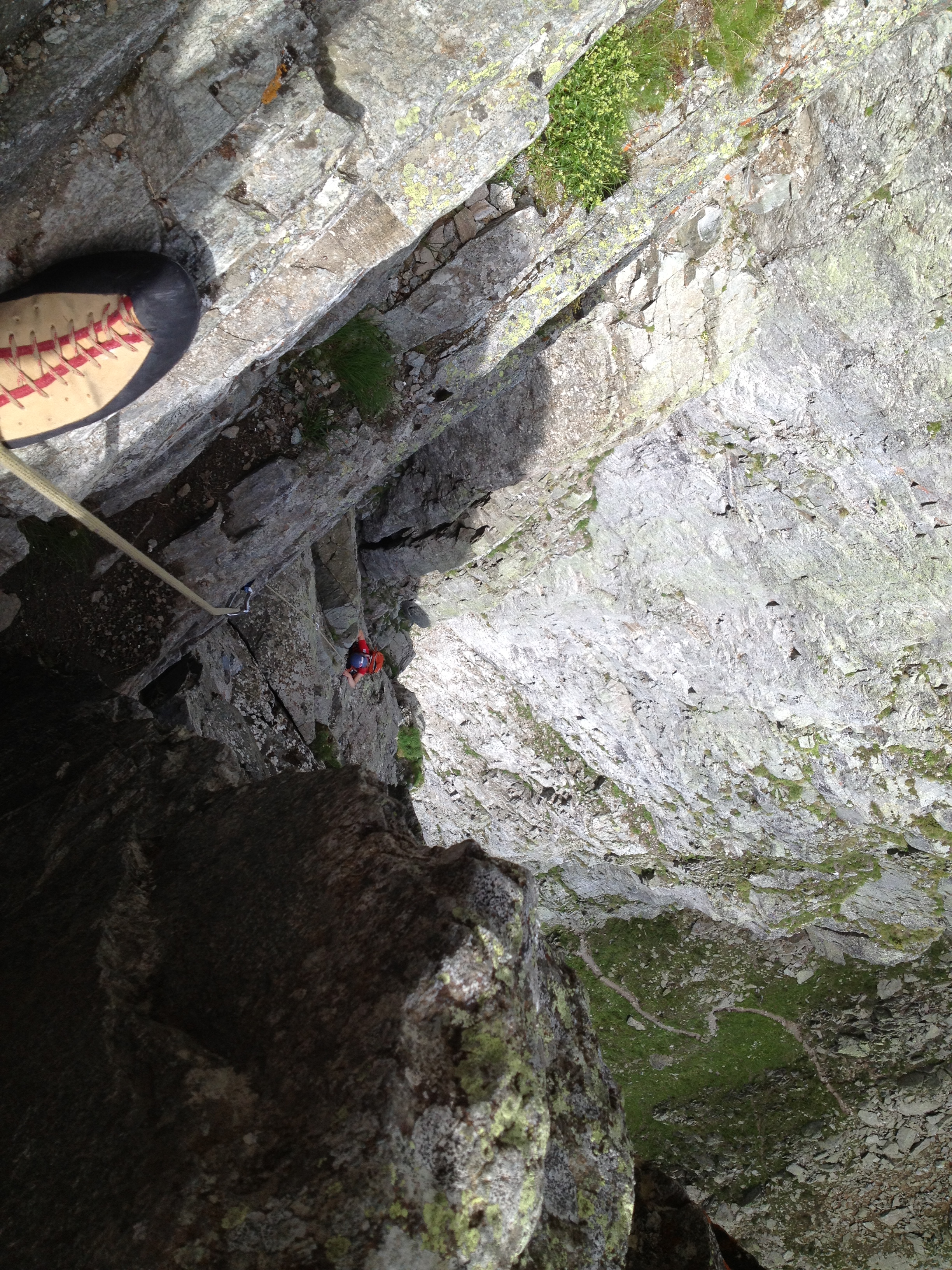 We had the whole first half of the route to ourselves, and the only other people we saw climbing it passed us when we stopped after the 4th pitch for some food. This was a surprise as it is a popular route.