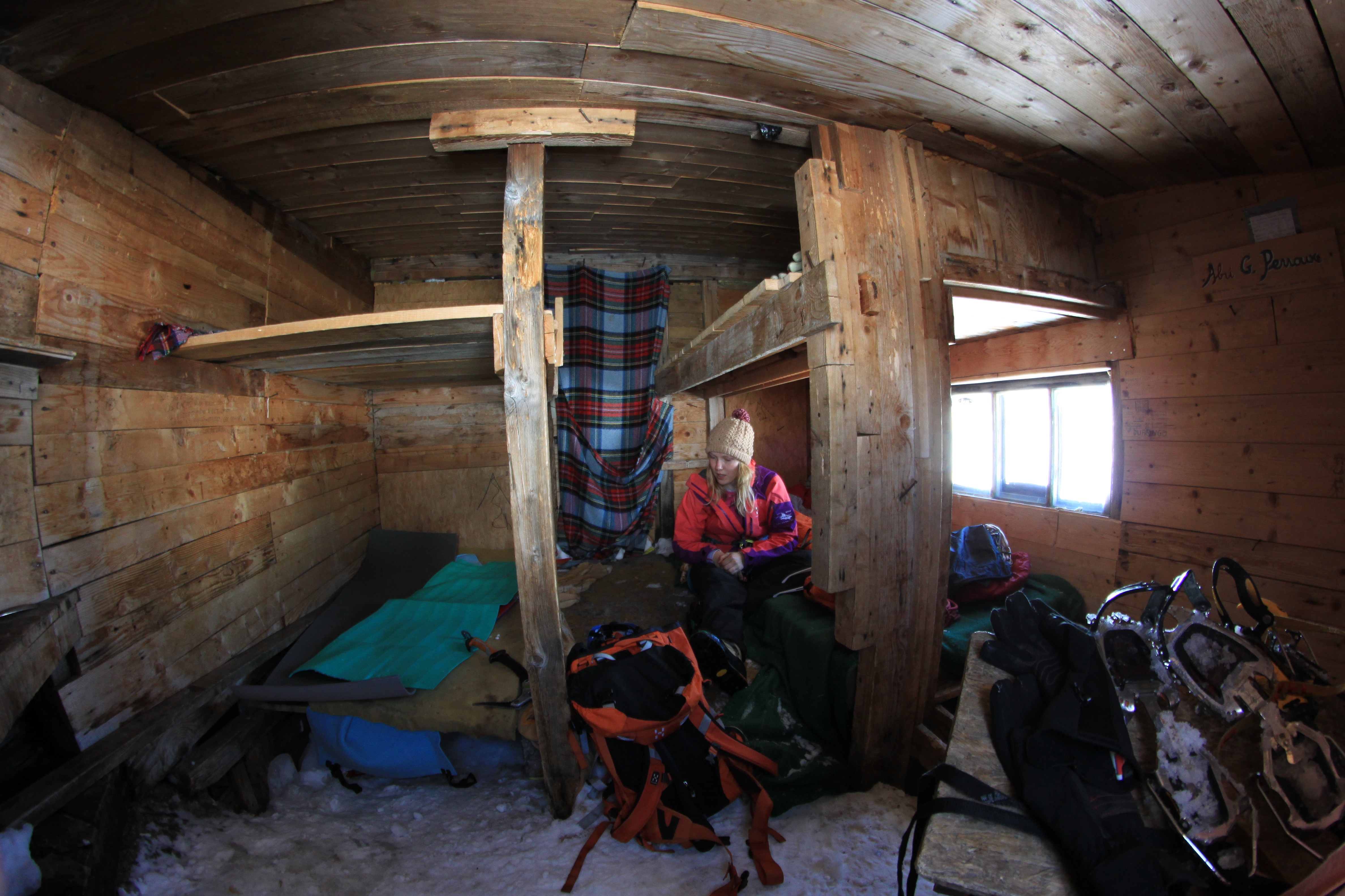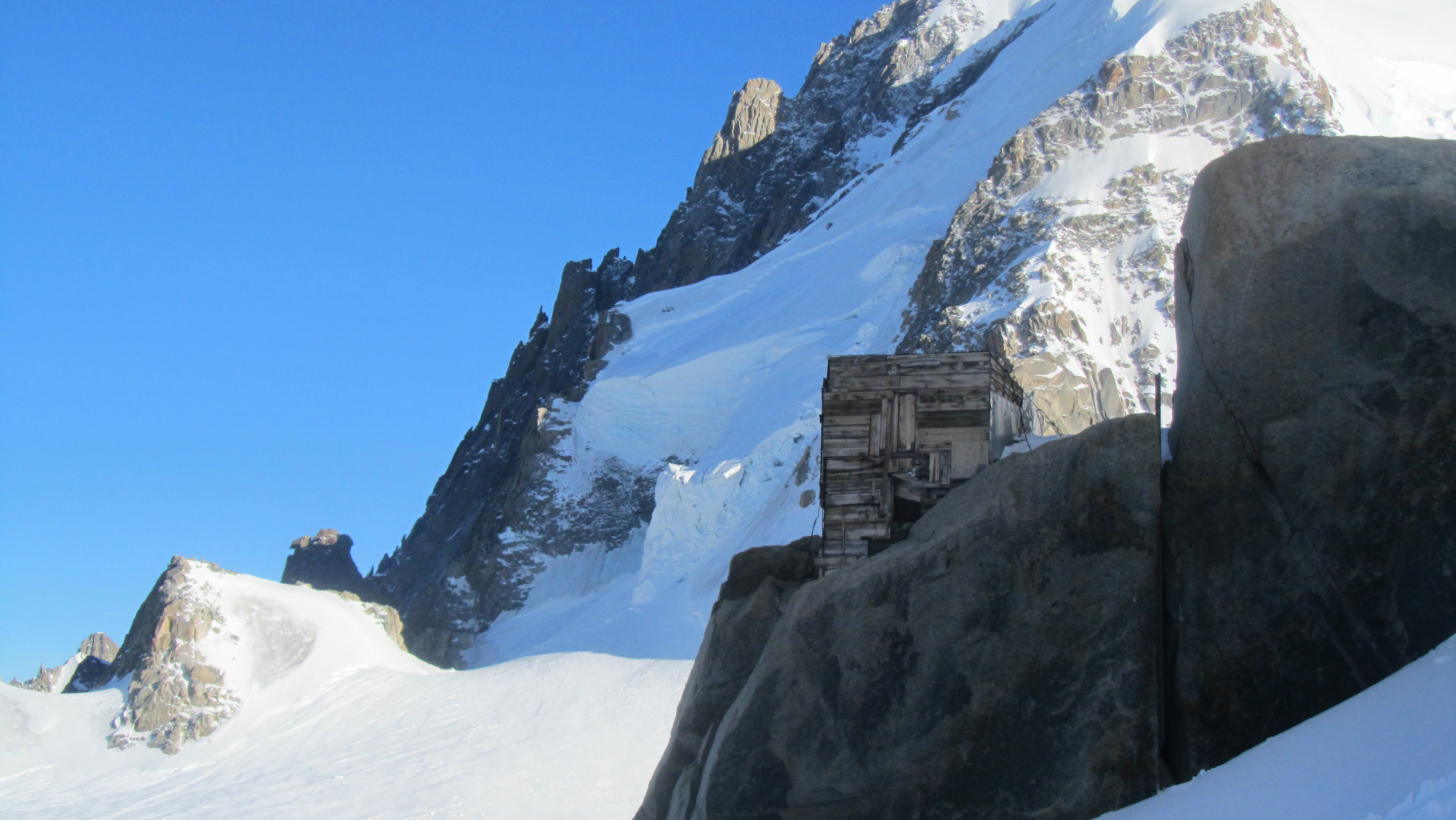 The hut is a lot nicer than sleeping in a tent and you have less weight to carry, to access it you can climb the very sketchy ladder or down climb from the cosmiques refuge. We also got there first so bagged the window beds with amazing views over the col du midi and all those in tents!