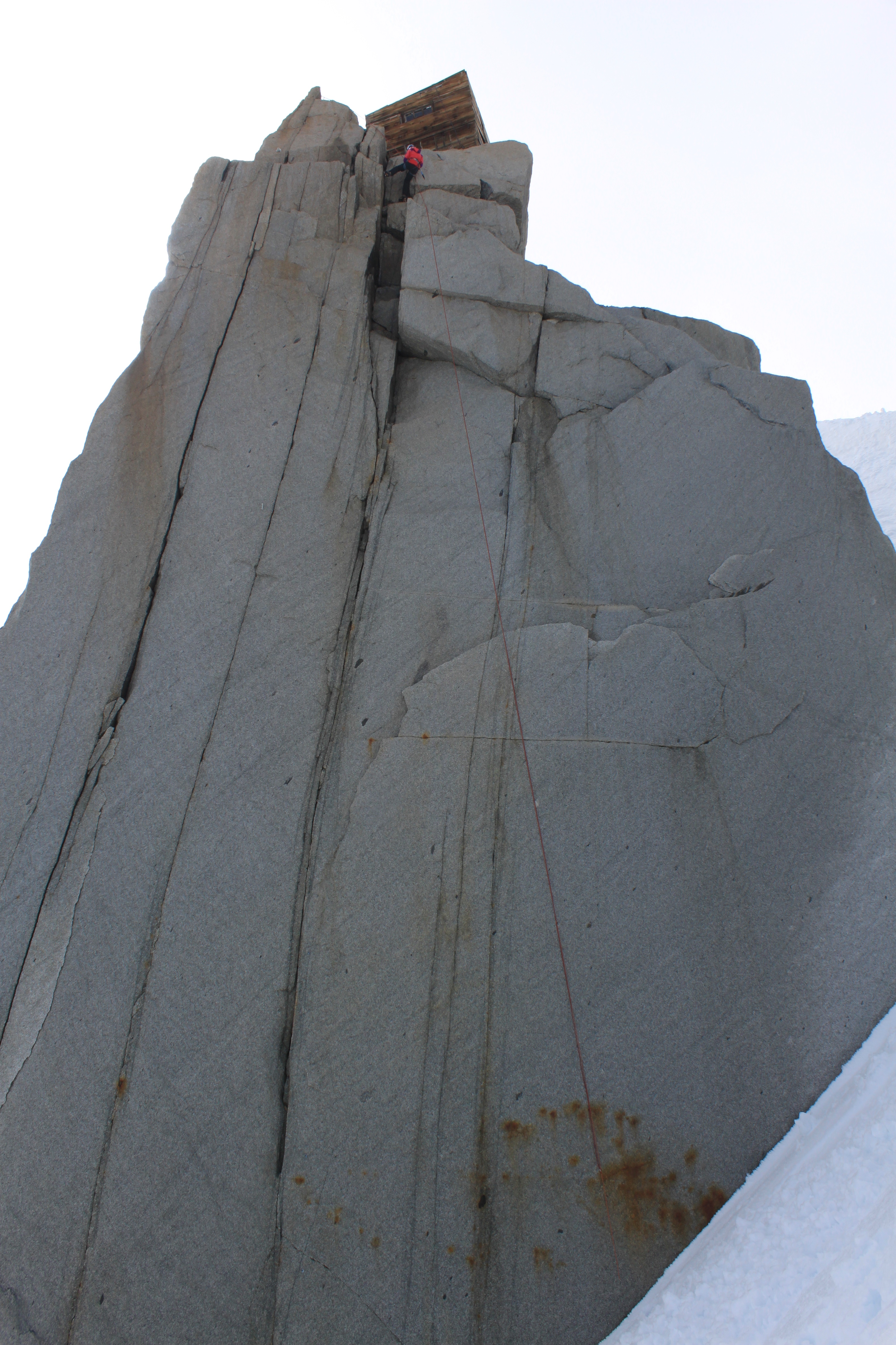 Leaving the hut/shed was good fun with a 30m hanging rappel down to the snow bank.