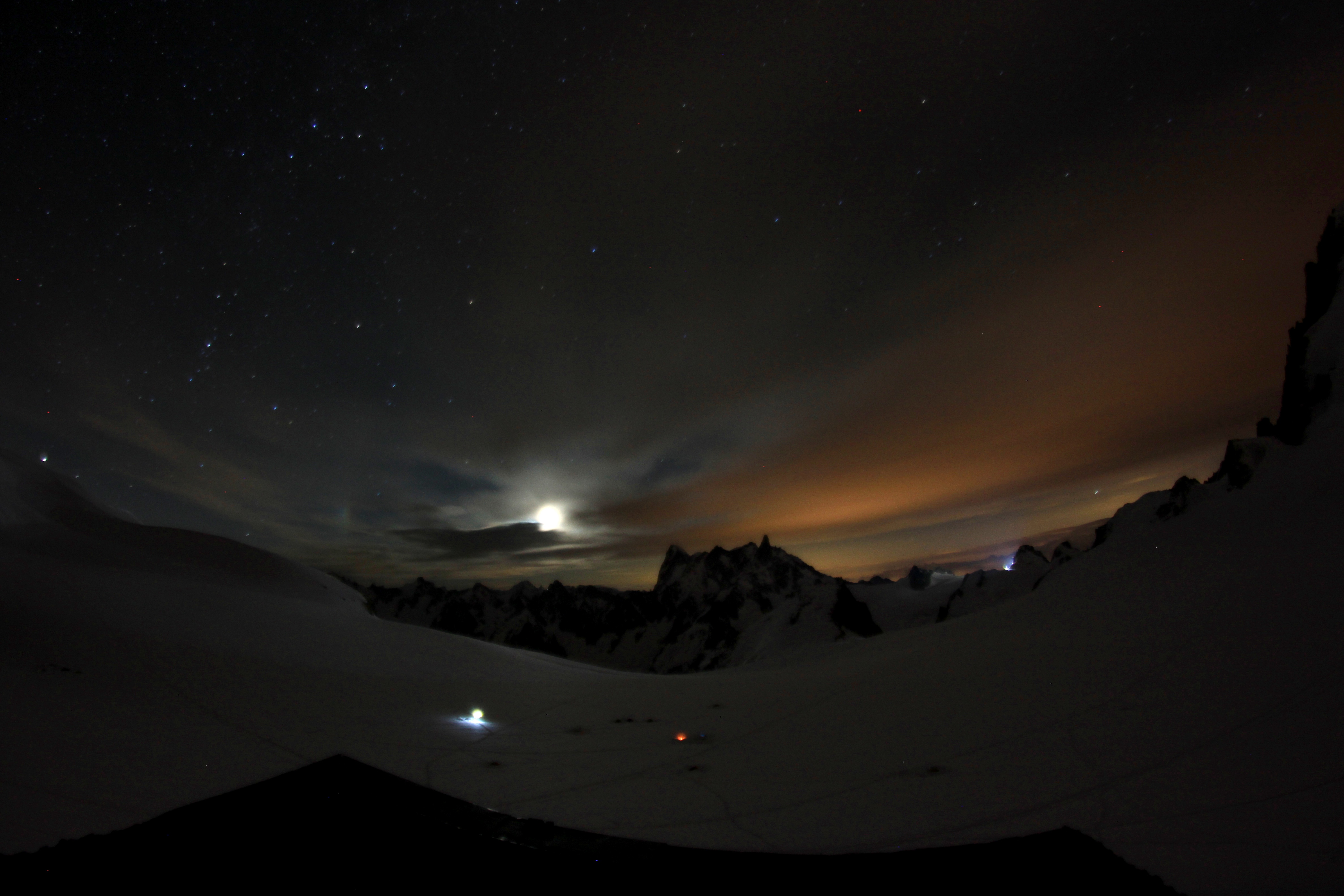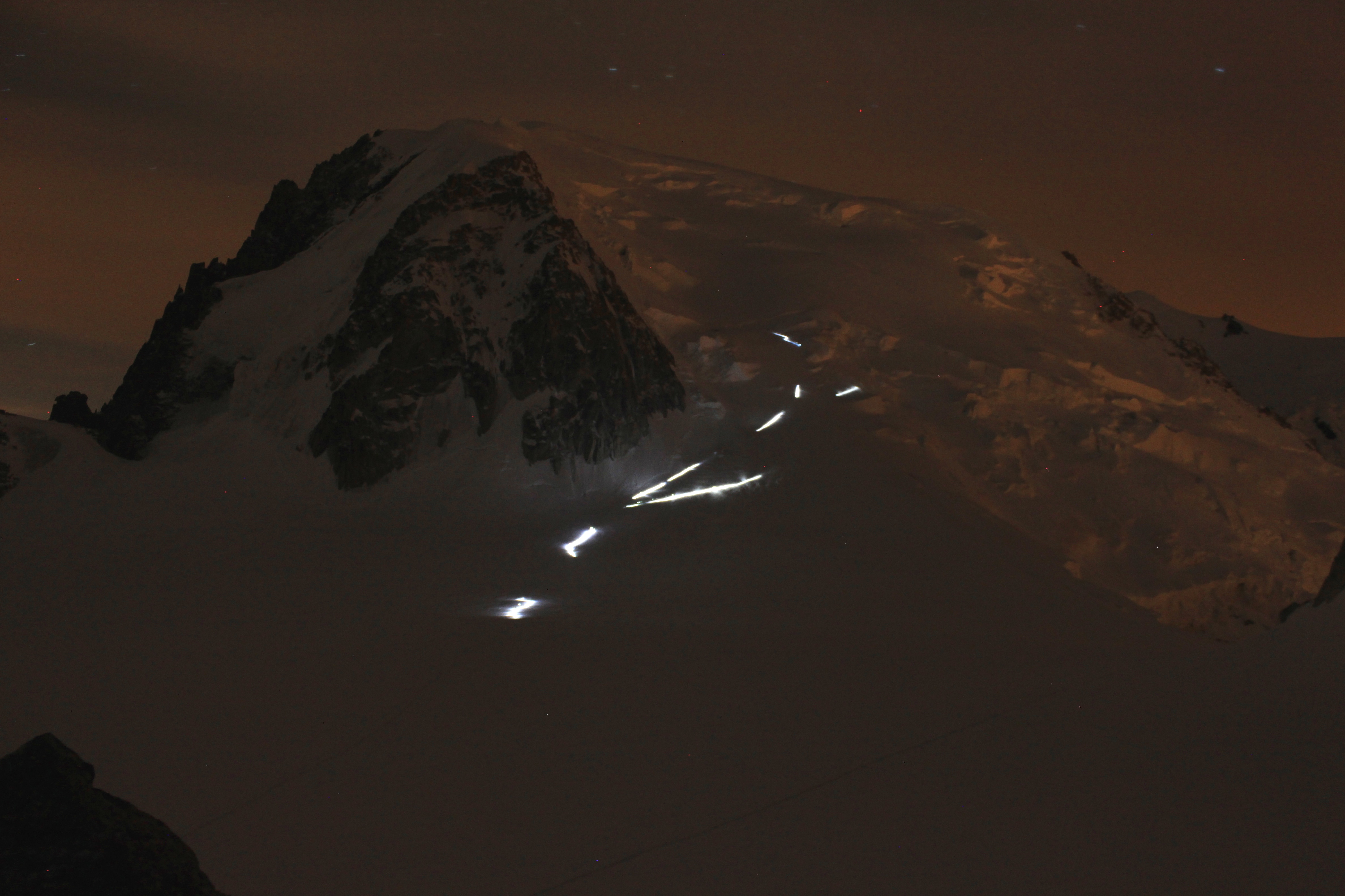 Looking out of the hut door at Mont Blanc du Tacul and the mountaineers heading up for Mont Blanc at 2am.