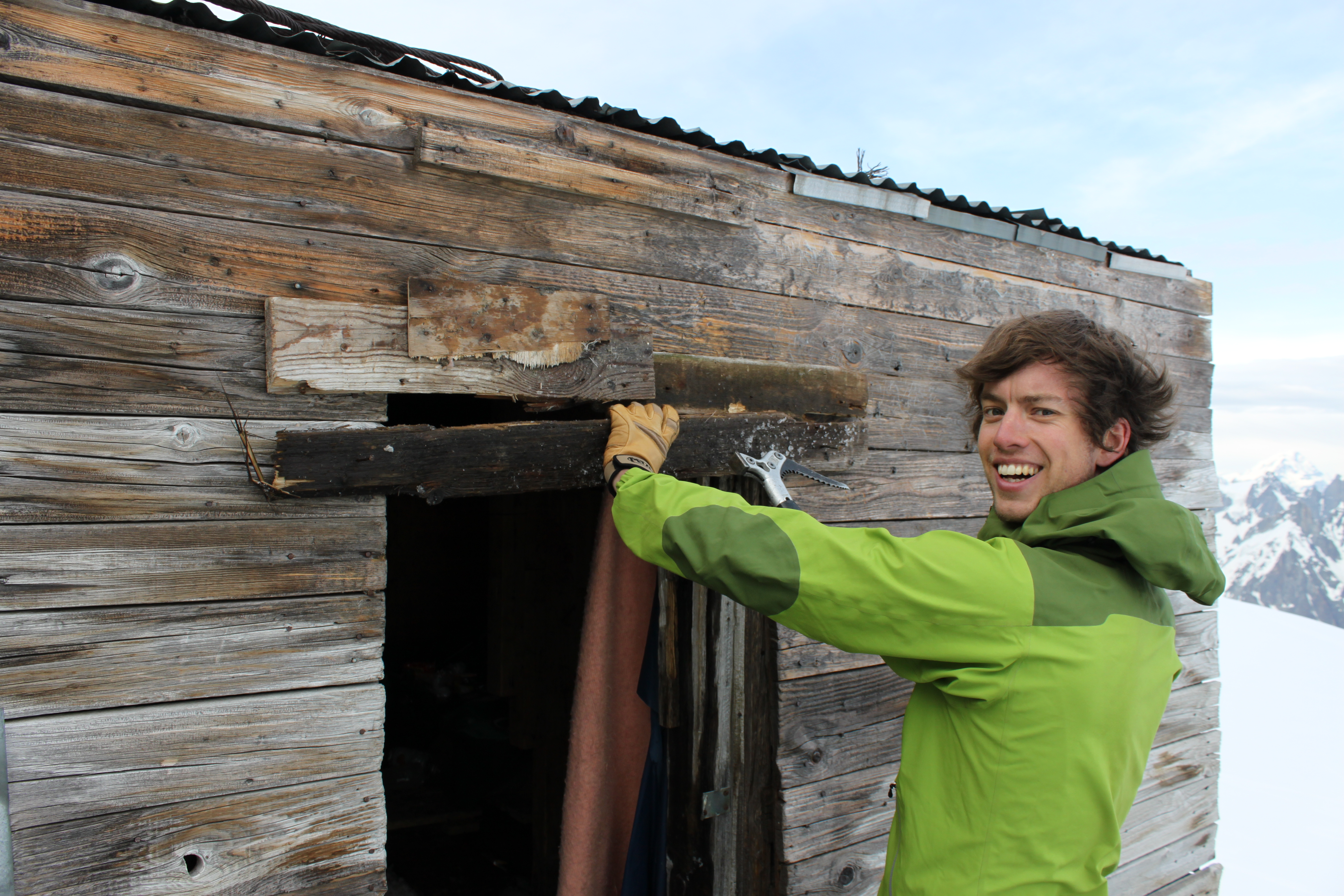 Starting up another last bin at the Midi we were aiming for the Perroux hut for another bivi, after helping some English 50 something year old put on his harness and crampons we escorted him down the arete and off to the Cosmiques refuge where he would await his guide, If we were not there who knows what would have happened to him. Before we settled in and started cooking some food we took time to fix the door on the small old hut, this meant digging out some ice, clearing the door way and salvaging some nails, we made that baby wind proof and were chuffed with our refurbishment’s so started cooking some ravioli and noodles, it was the first time I had used the hammer on my axe, not sure if that is its intended purpose!