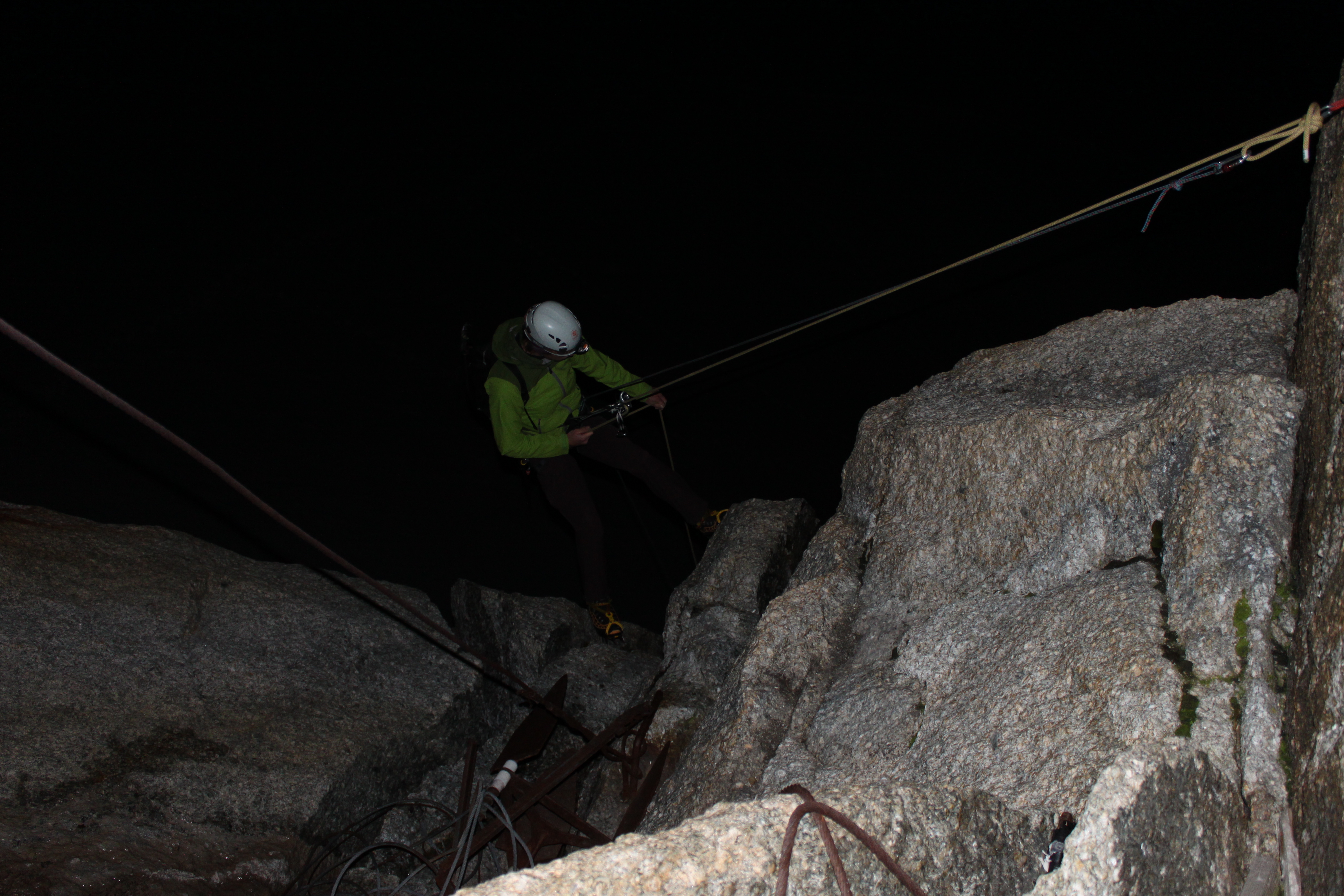 We were in bed early for a 3am wake up and out by 4am after some coffee, orange juice and a couple of cereal bars. Rapping in to the dark is good fun and we were on the move roped up just after 4.