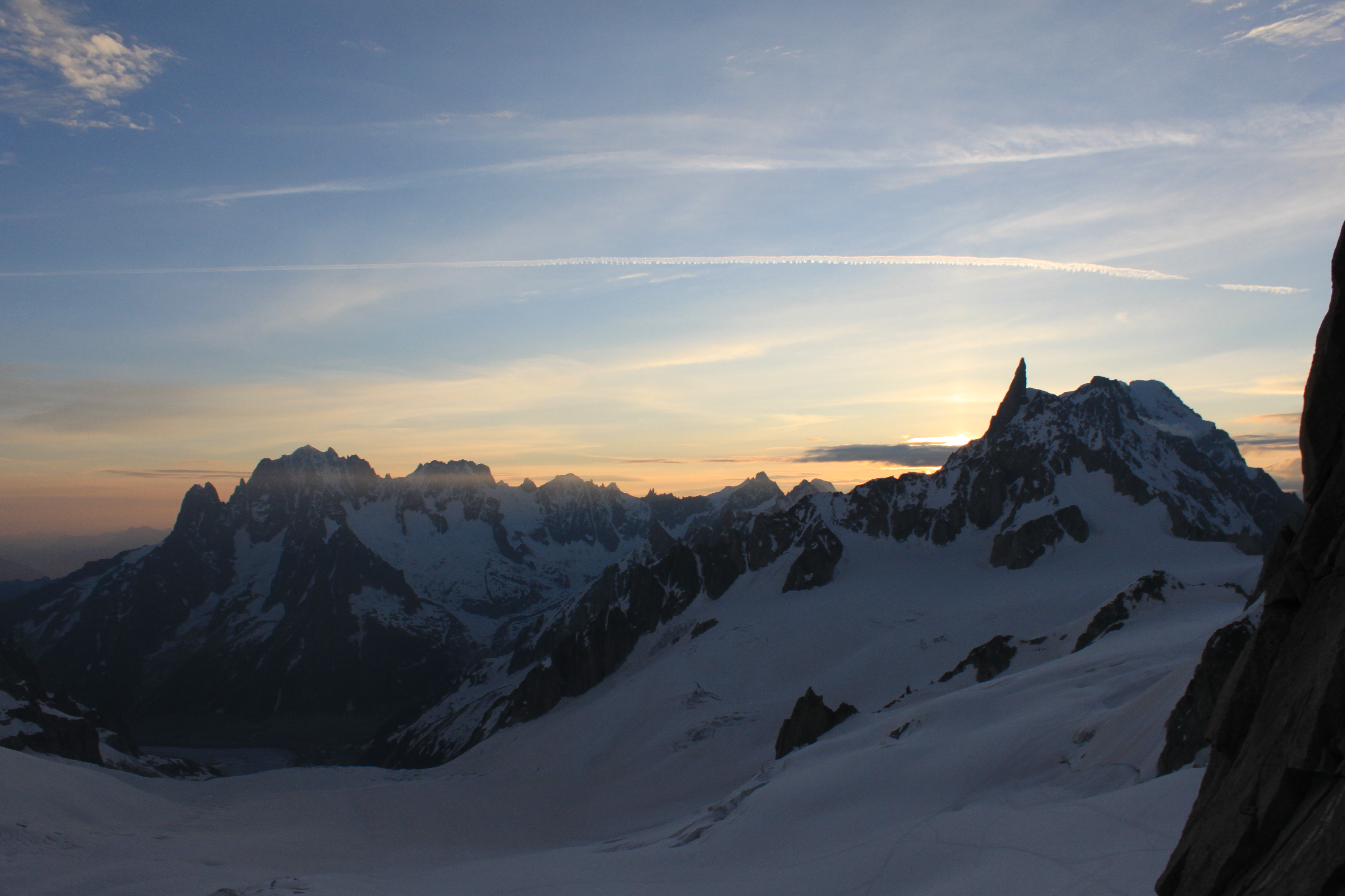 We opted to take the left couloir with a longer ice section, this took us higher up the upper snow field and was great fun with a small rock and ice crux at the top. The sun started to come up as we were half way through the ice offering amazing sunrise views down the Vallee Blanche with the sun coming up behind the Dent de Geant.