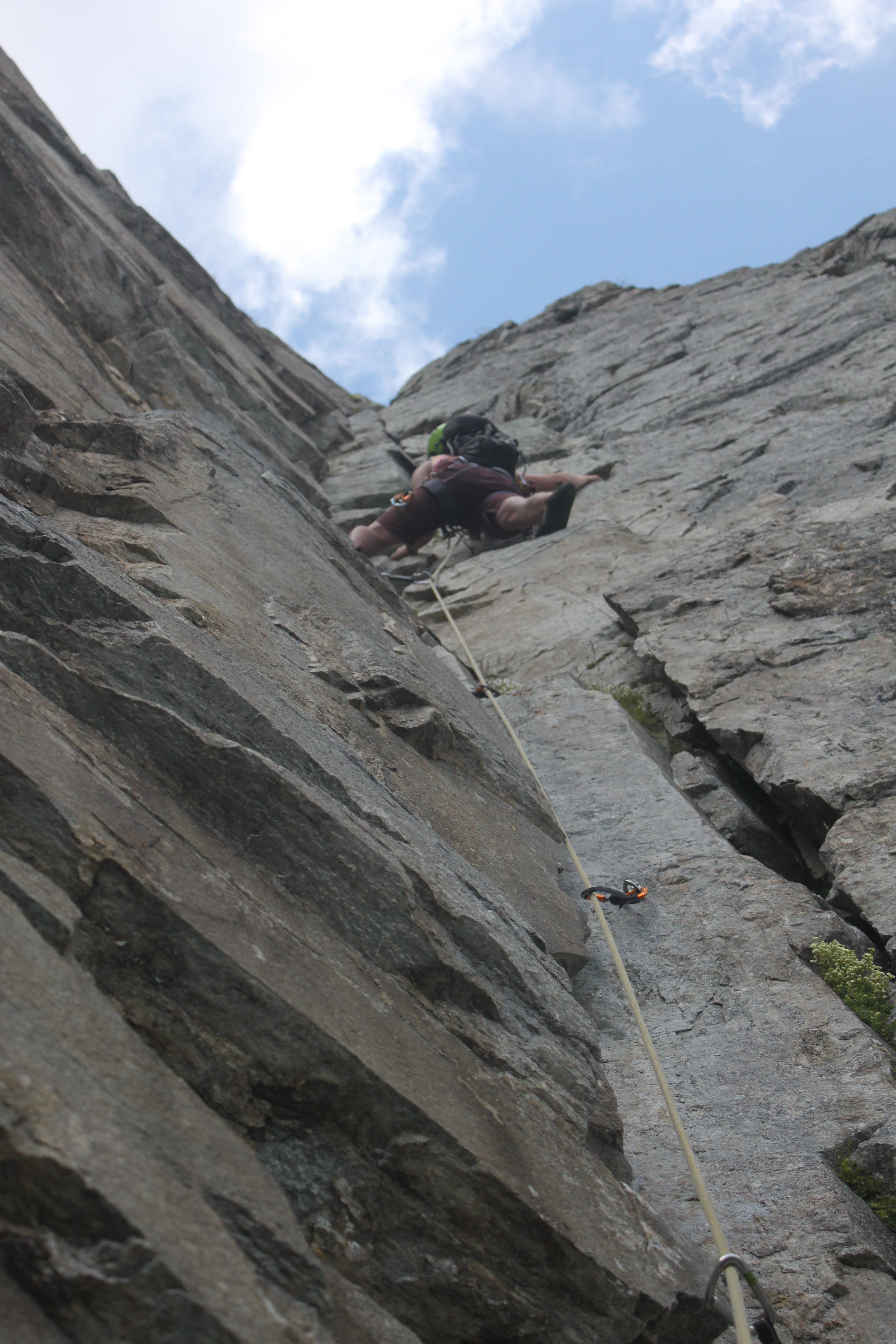Kat led the 2nd and 3rd pitch which were 5b and 5c, these pitches moved back towards the right and then up to the start of the crux corner pitch.