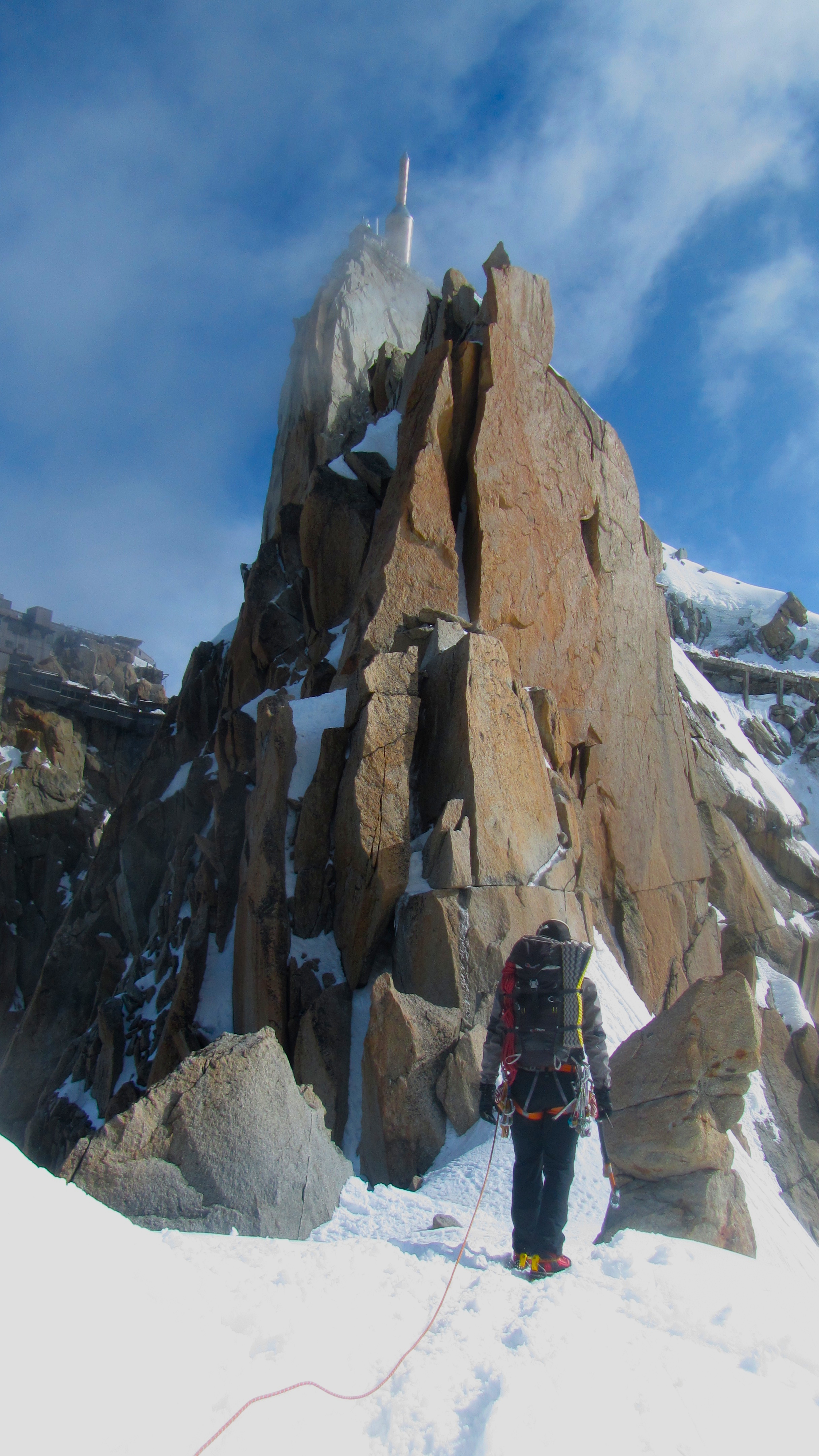 Approaching the final rock towards the viewing platform. There is a small 3m rock climb to get to some bolts for a nice belay up the south chimney.