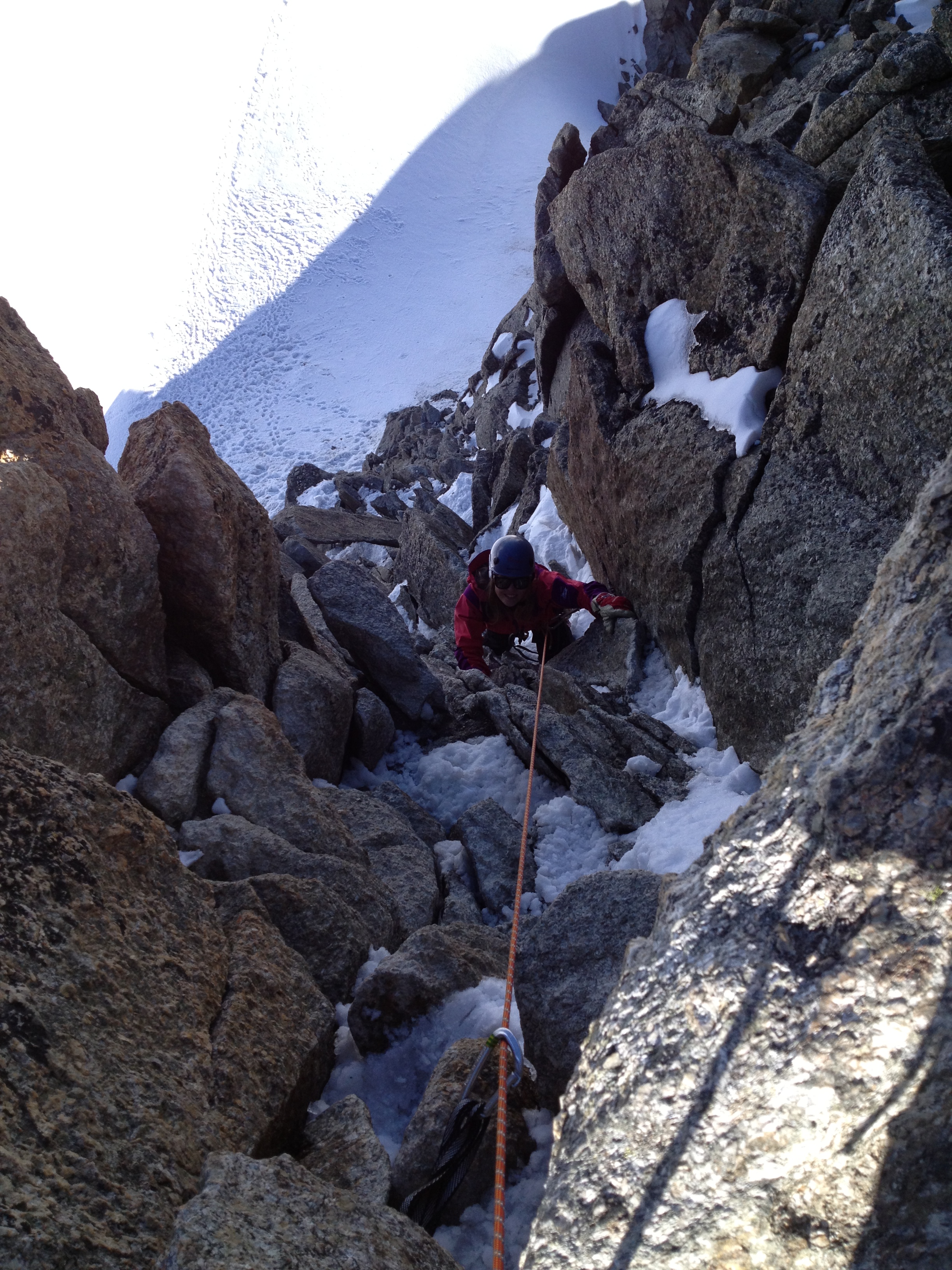 As we were approaching the final chimney one person who was off first bin climbing solo was approaching us but this is the only time we saw anyone on the whole route. The final exit chimney is classic, not too hard but it feels very exposed as you look all the way down to the Cunningham Couloir. I flew up it with Katsu belaying and just below the top she started to follow for the easy first section before I reached the top bolts to set up a belay.