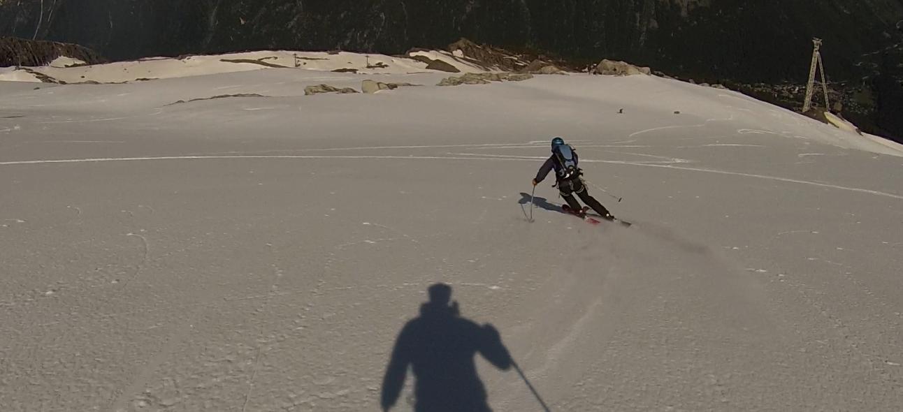 Once back at our skis we waited at the top station for Graham and when he arrived we headed down the front face on some very hard July snow. It did soften in places to some nice corn but it was like riding a big groomer and was good fun especially for the 1st of July!