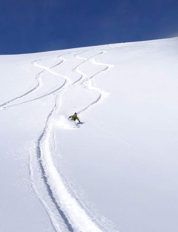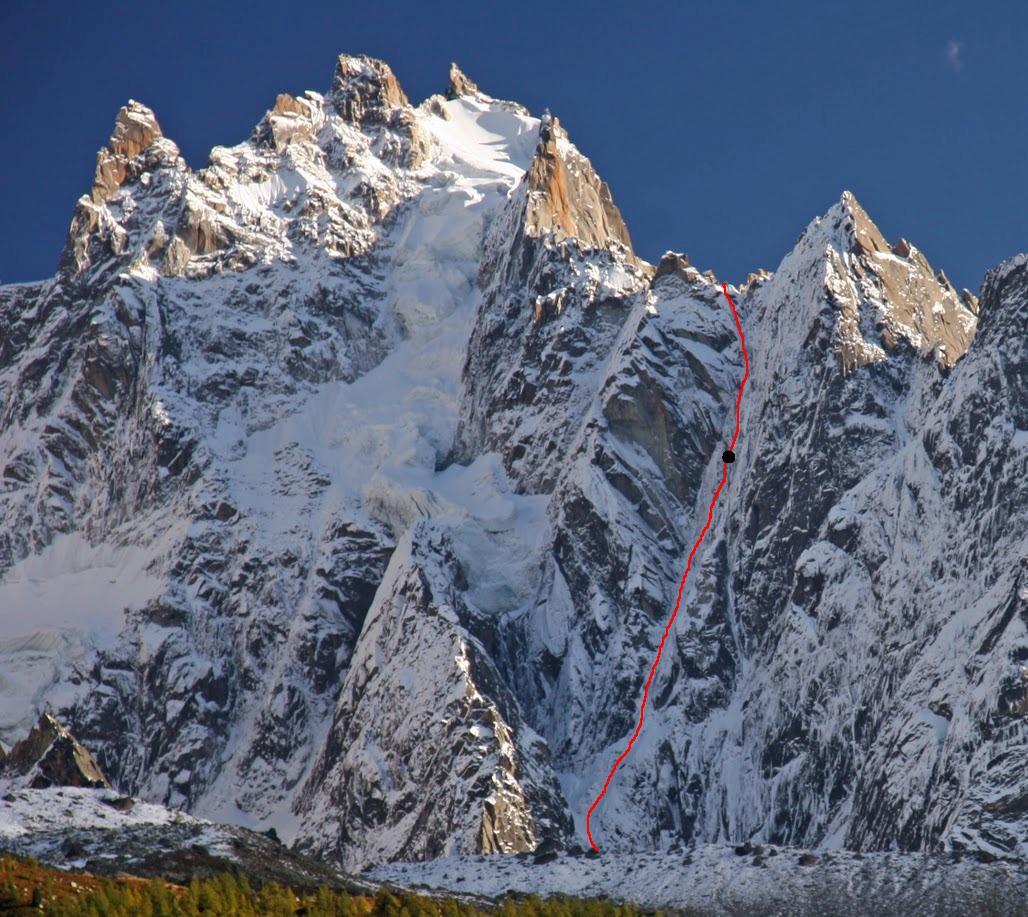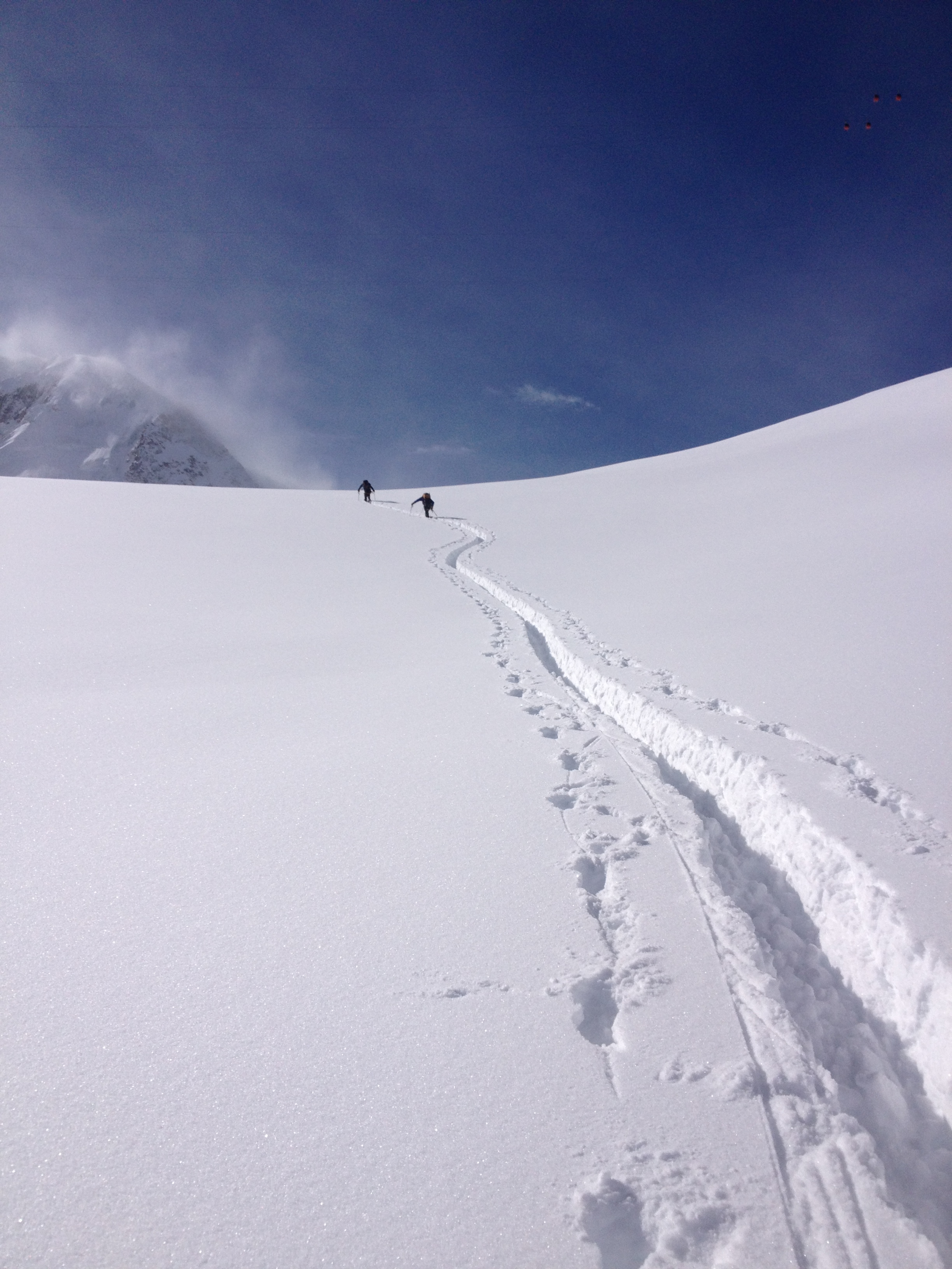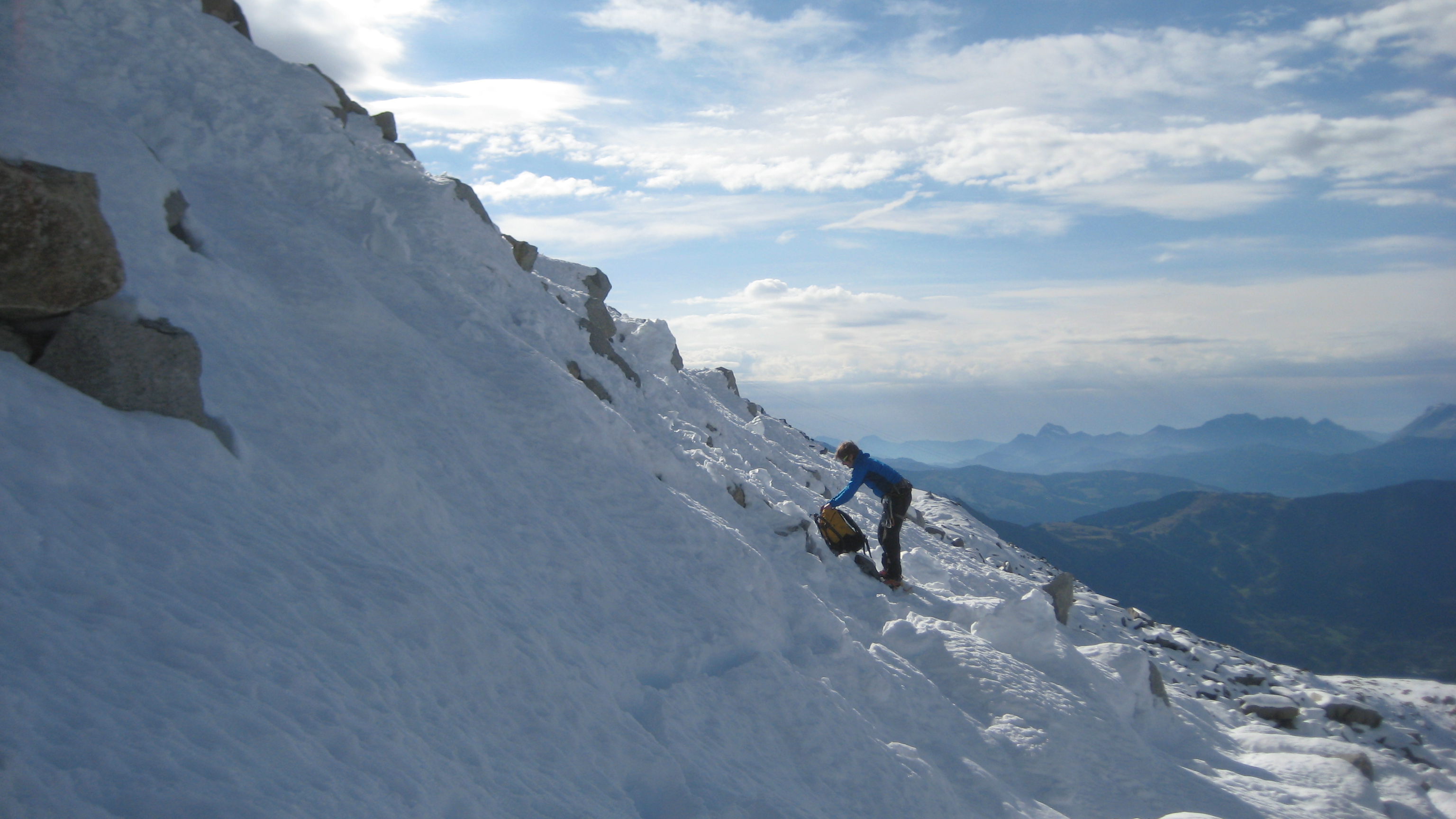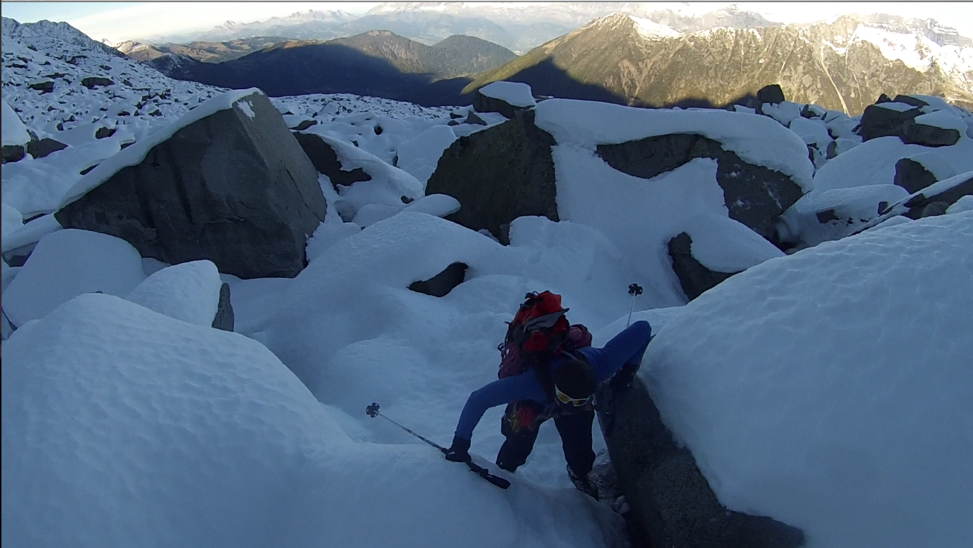 The nice footpath quickly changed to breaking trail through huge boulder fields in the moraines in sometimes thigh high crusty snow. After an hour we had made it through this minefield and onto the lower slopes of the Aiguille des Pelerins and we were ready for crampons to start the climb.