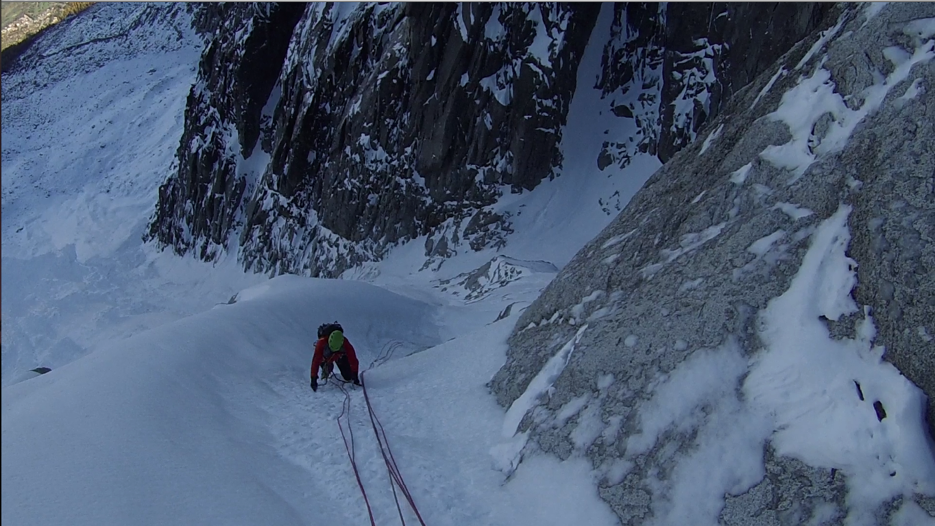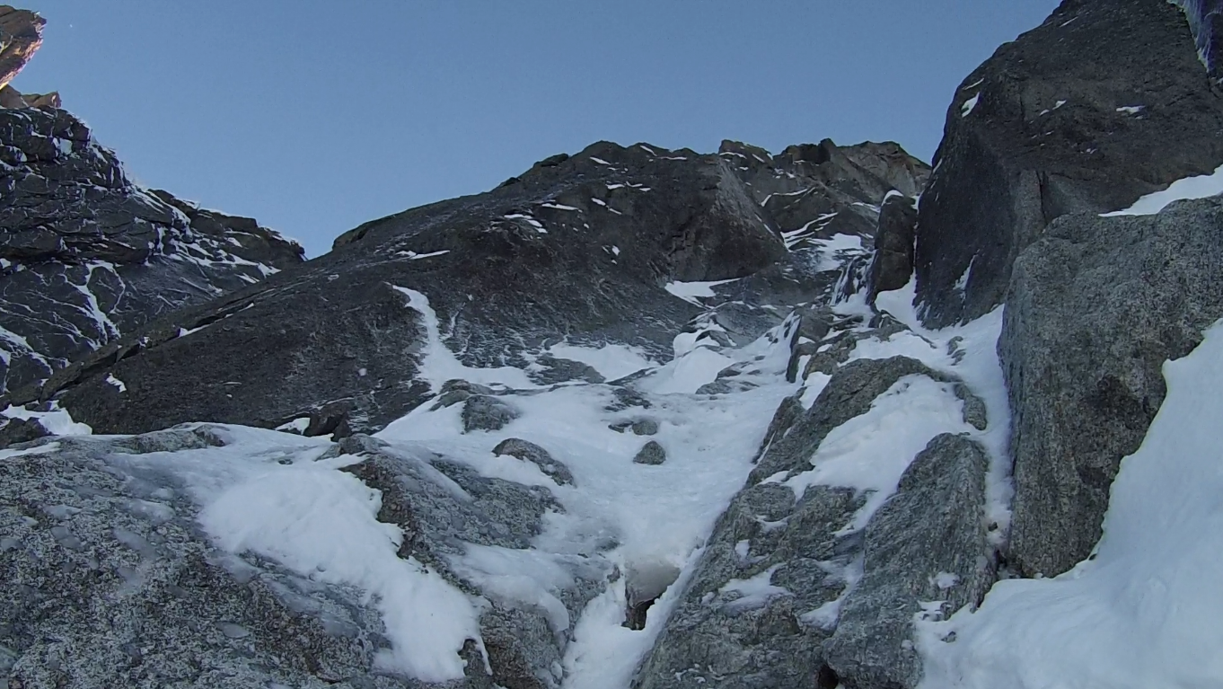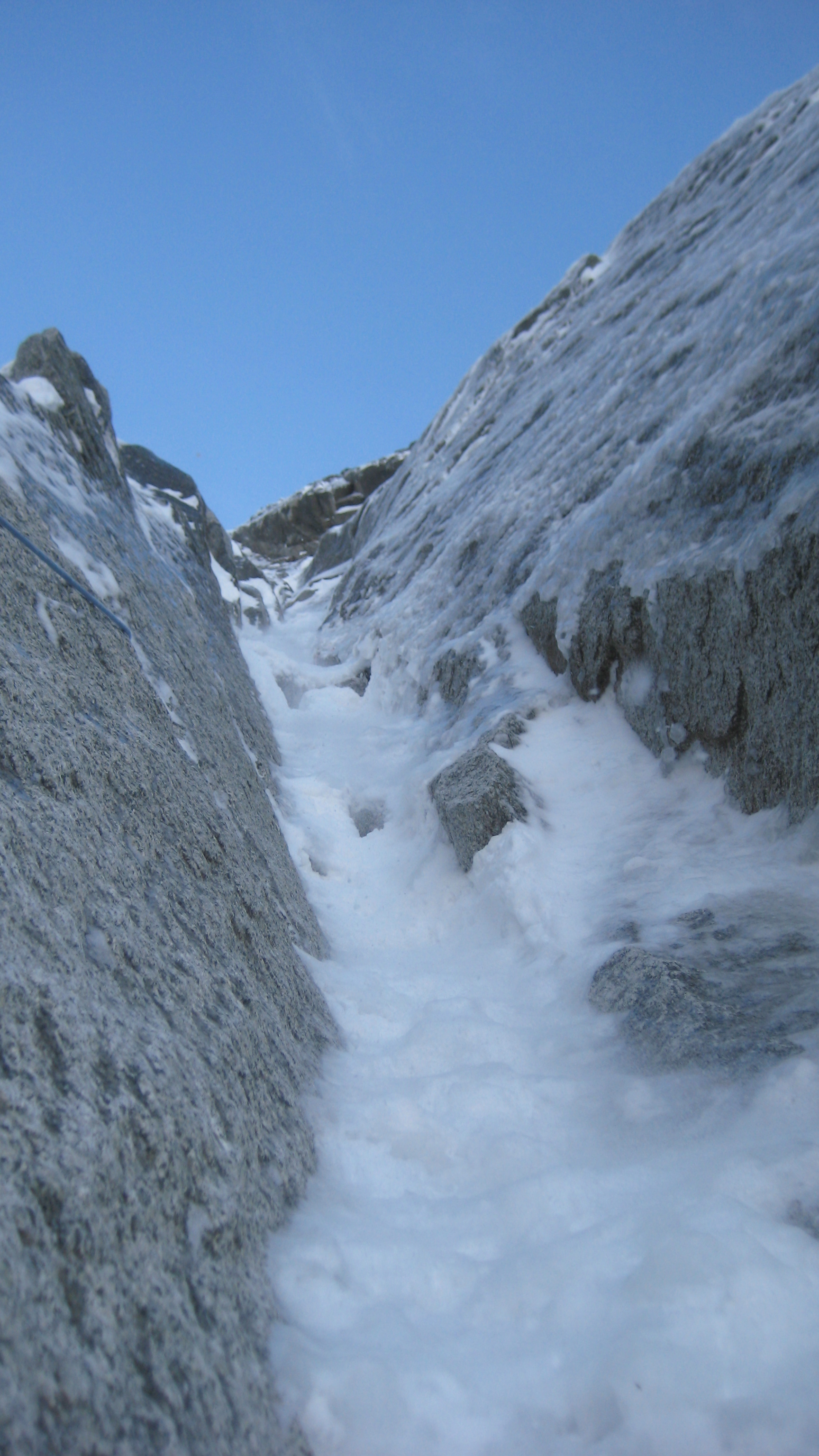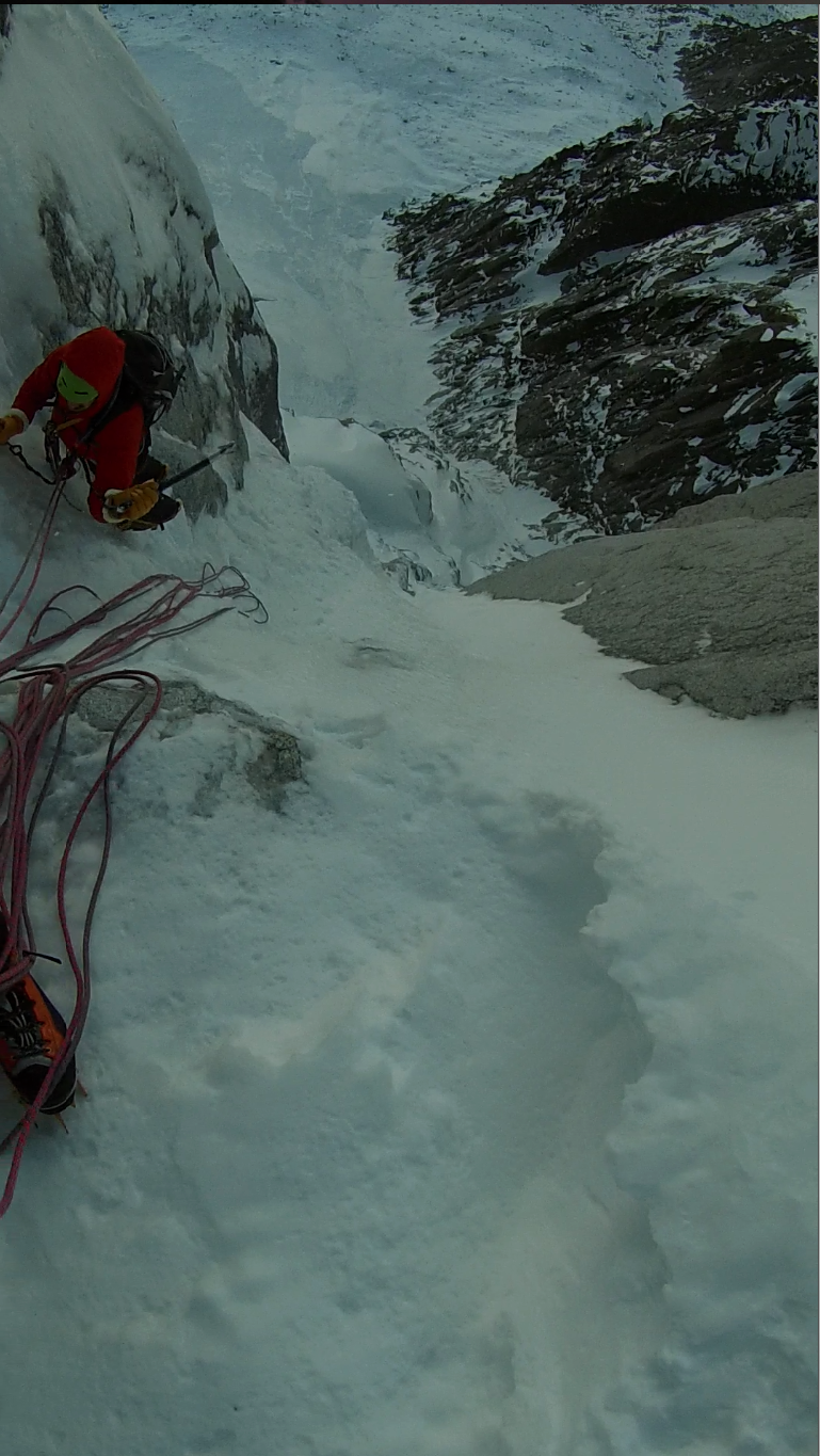 To get to the start of the serious climbing we had to start up the small mixed gully to reach some 55/60 degree neve slopes that took you up to the first pitch.
