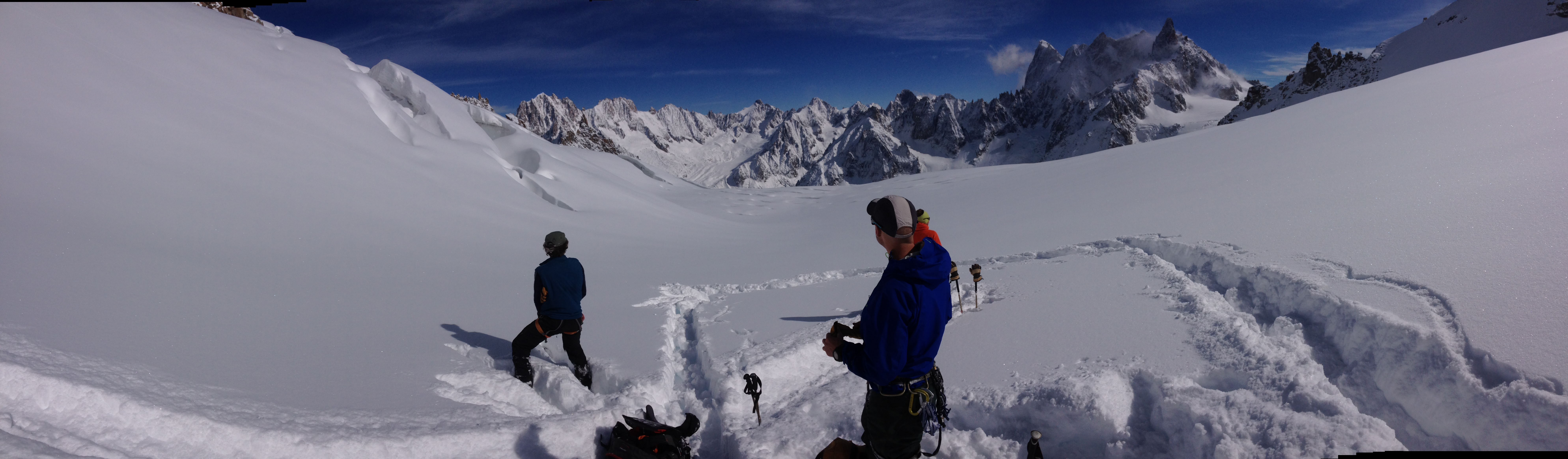 We arrived at first bin at the Aiguille du Midi cable car at 8:30 and we were well on our way, after a quick toilet stop, by 9am.