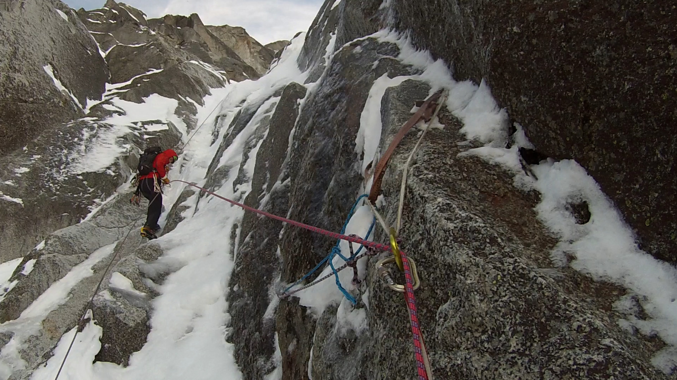 We had a little trouble when Tom was trying to get over a 80/90 degree ice bulge which did not look very safe, and three Italian climbers were rappelling over him and kicking down a lot of ice and spindrift. He made it over after a short wait hanging from his tools and then it was my turn to second it.