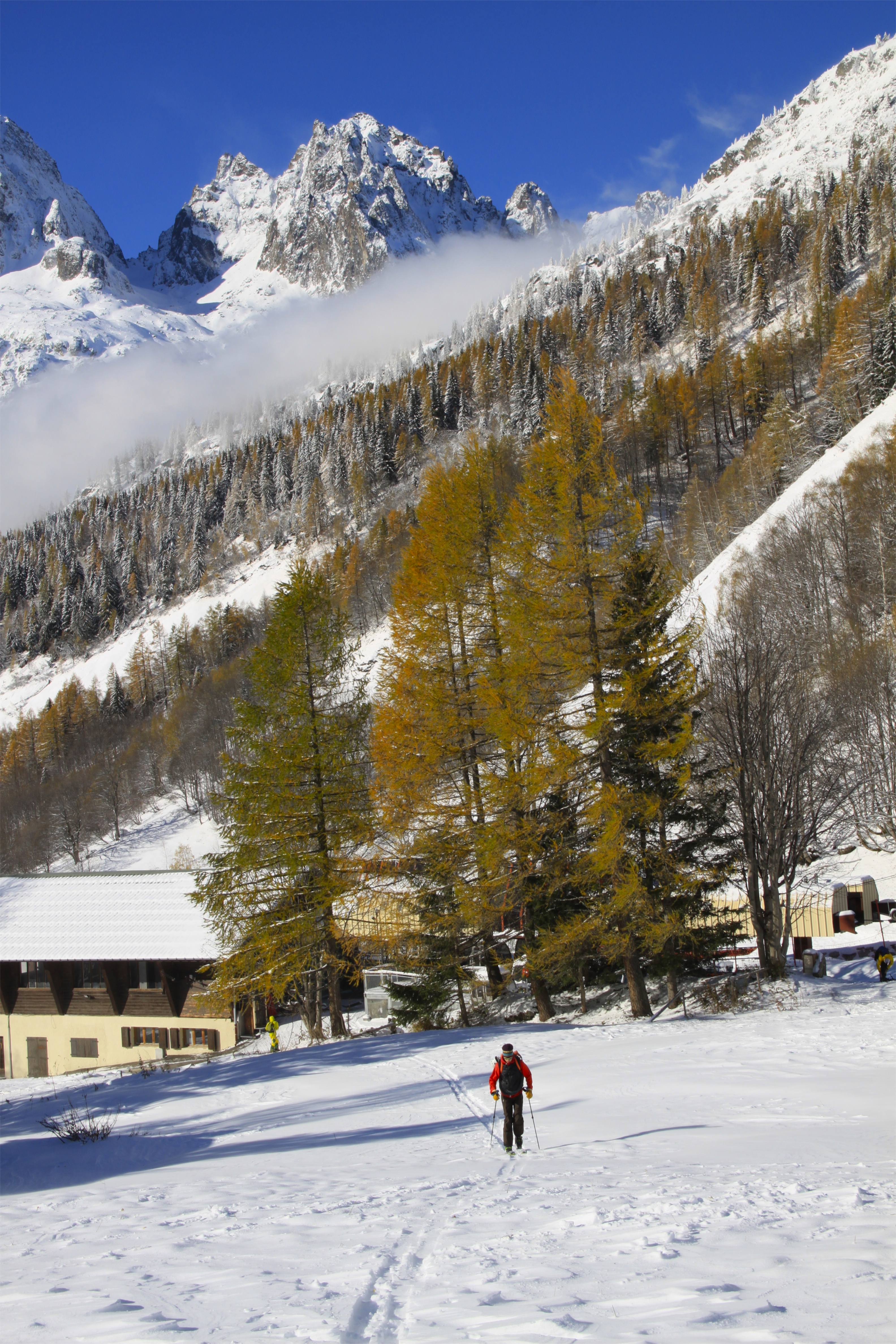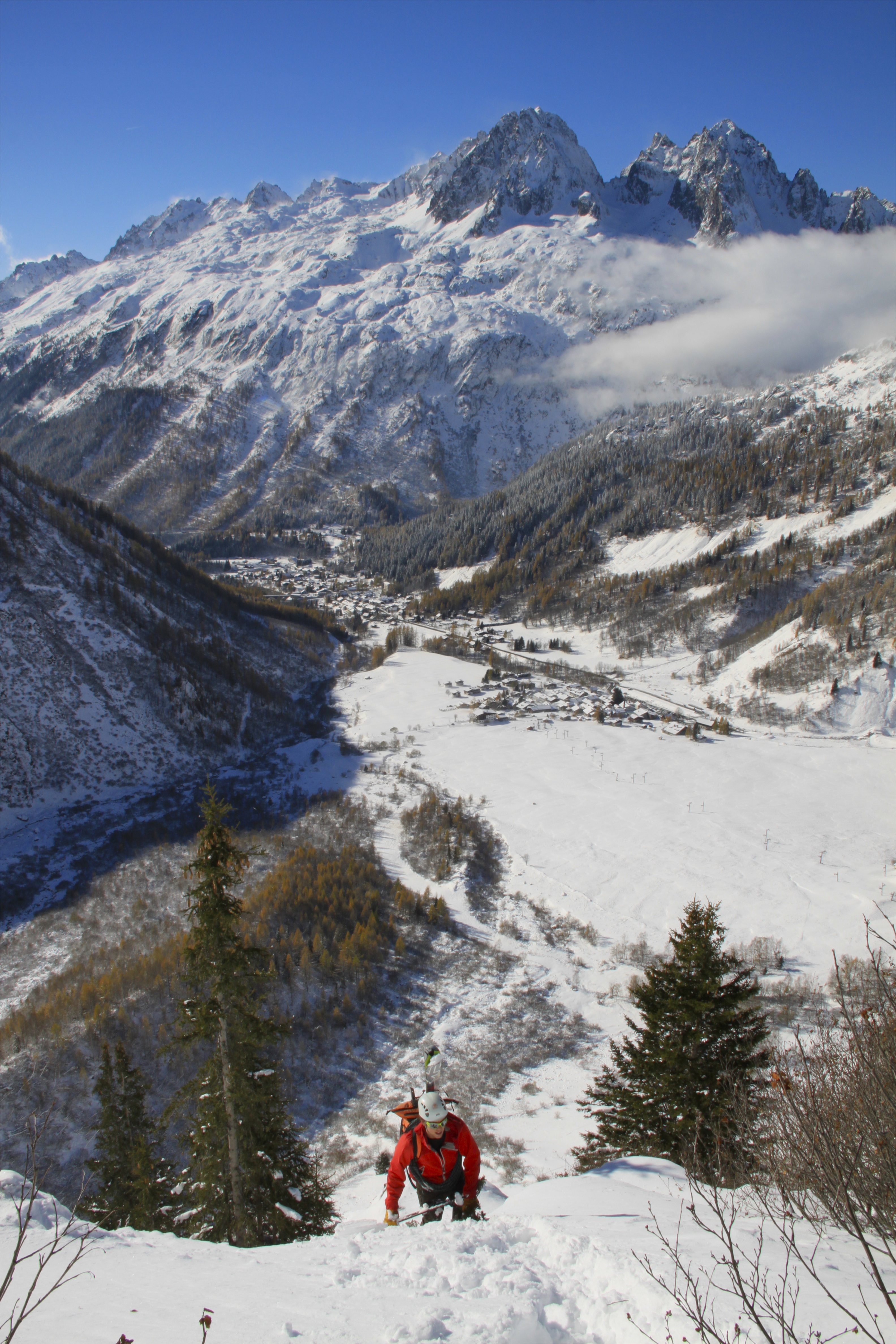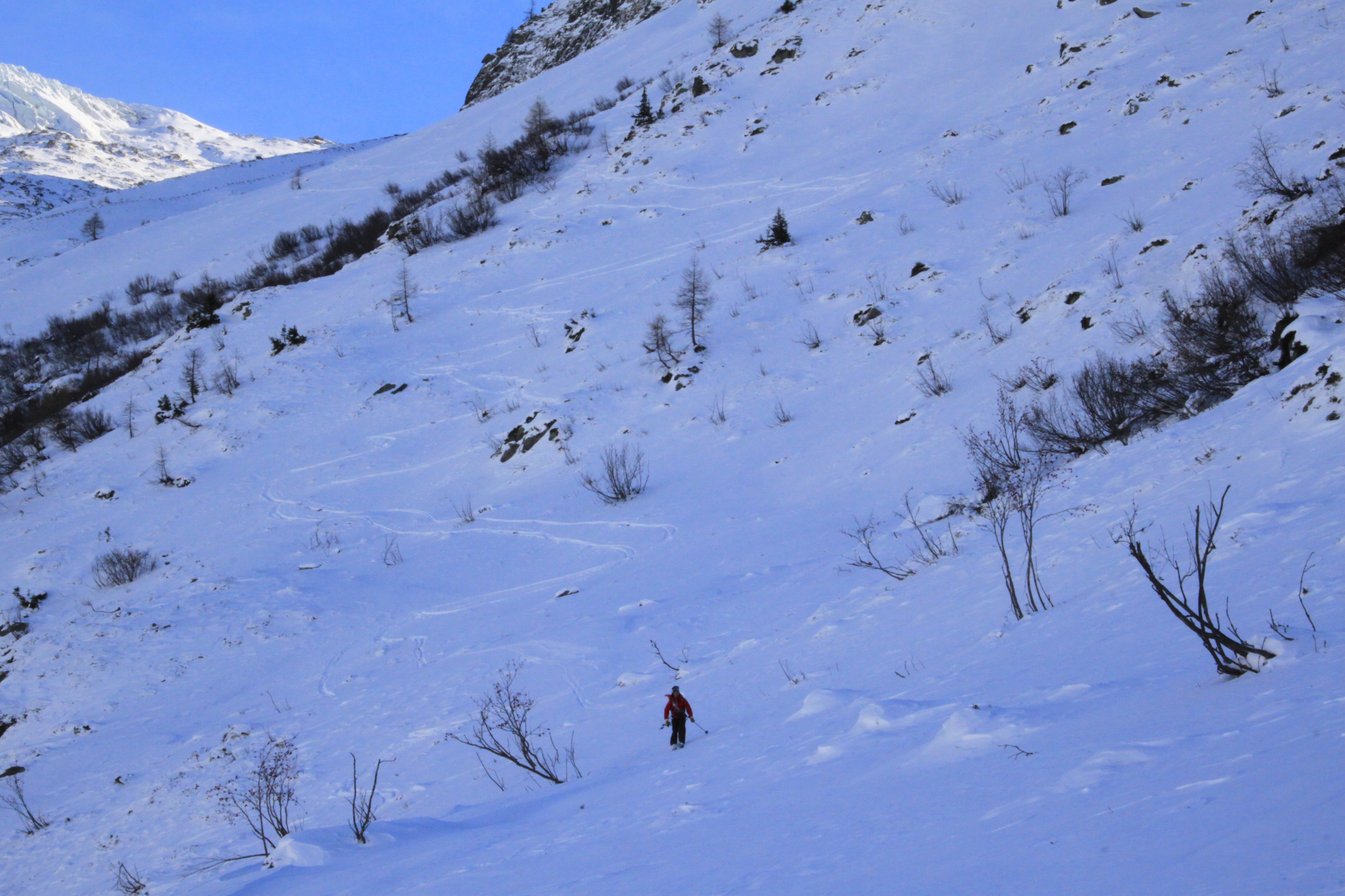 We descended across the lower slopes of the Chardonnet and then met up with the normal route on Col du Passon and followed it back to Le Tour. The snow was varied from hard wind blown snow, bullet hard ice, horrible crusty snow and the occasional bit of powder. It took us a while to find our way and then just when we thought we were home we lost sight of the path and headed into the trees looking for it. We spent just over an hour down climbing the dense trees and sliding about on snowy grass slopes until we finally found the path. Looking back up from the car park we could see where we went wrong and were gutted that we didn’t find it and save ourselves the mission.