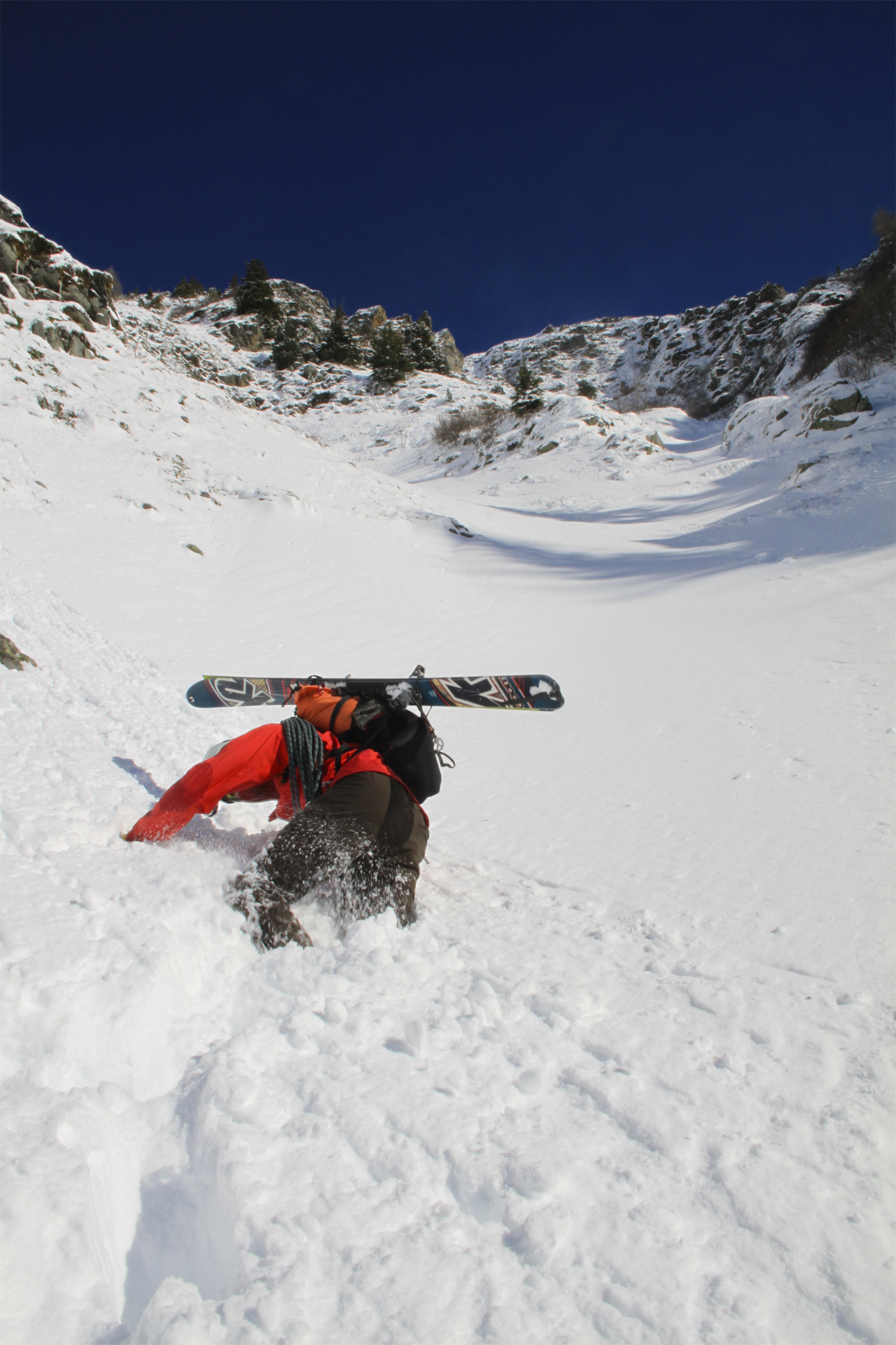 After 45 minutes of skinning we had our skis on our back and were heading up the steep couloir looking for the path, we knew it would be hard to find but after a lot of scrambling around in deep snow and climbing up bushes and in between trees we found it and were heading towards the glacier and looking forward to getting our skis back on and skinning up the left bank of the moraines.