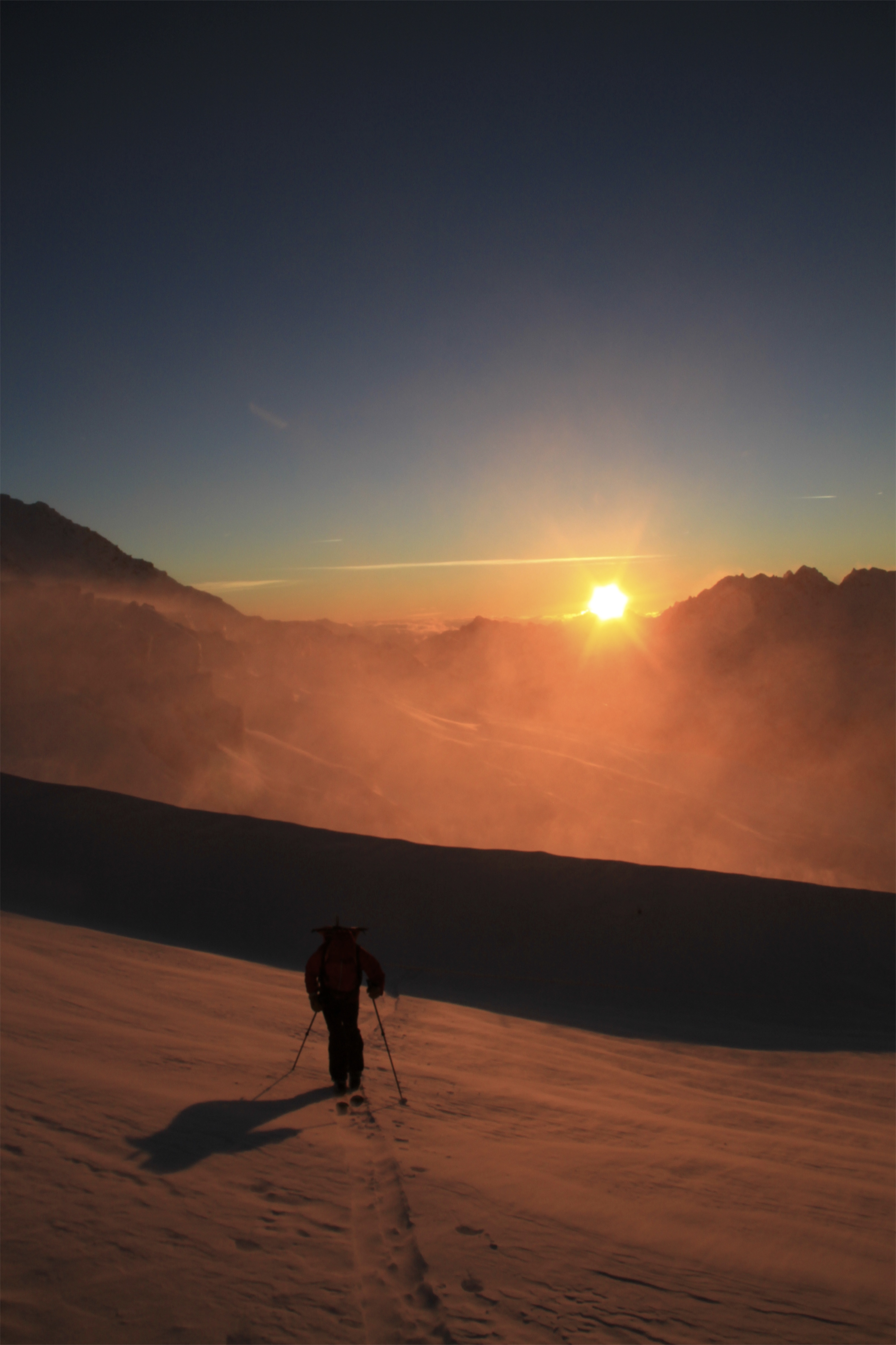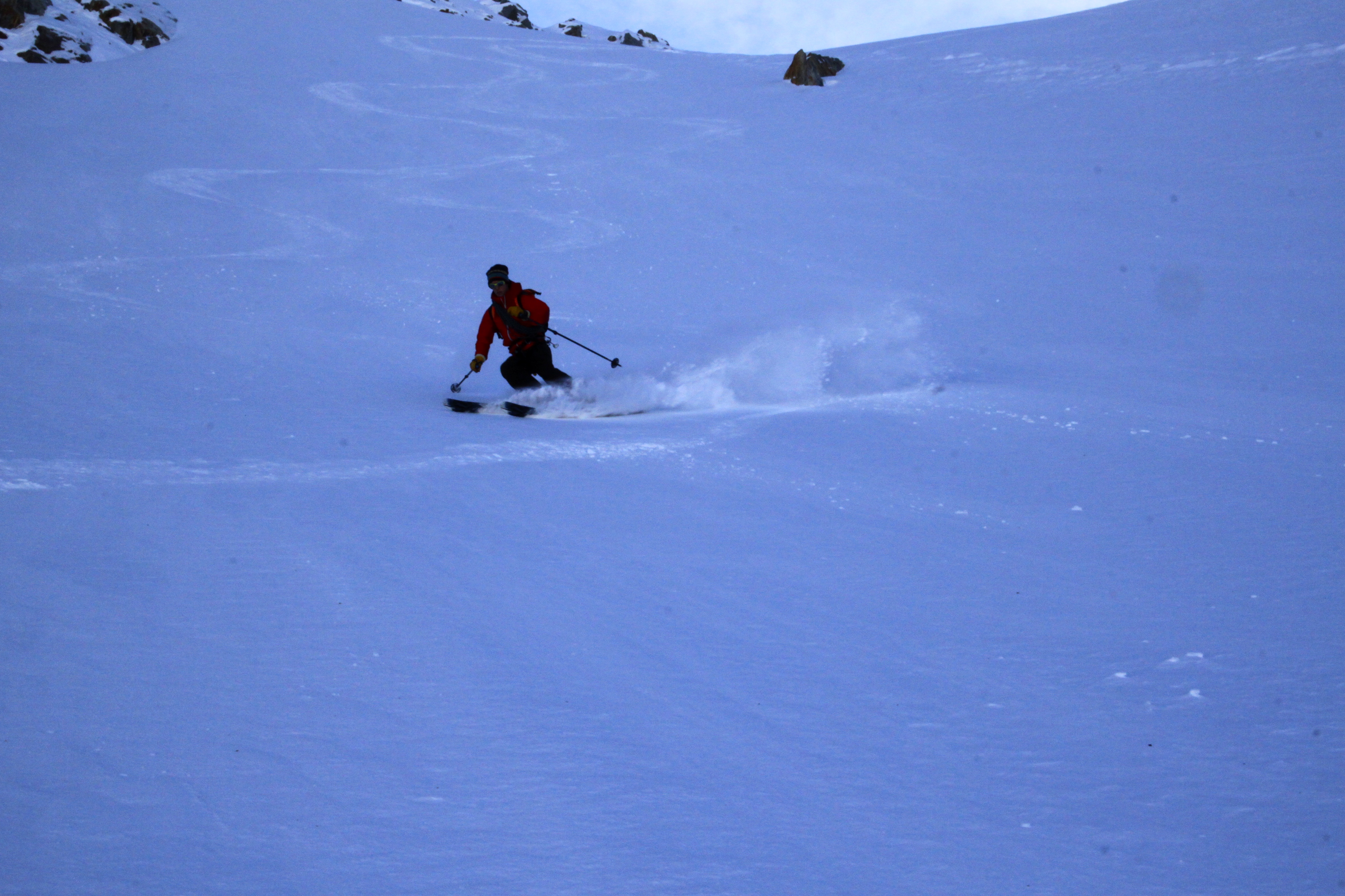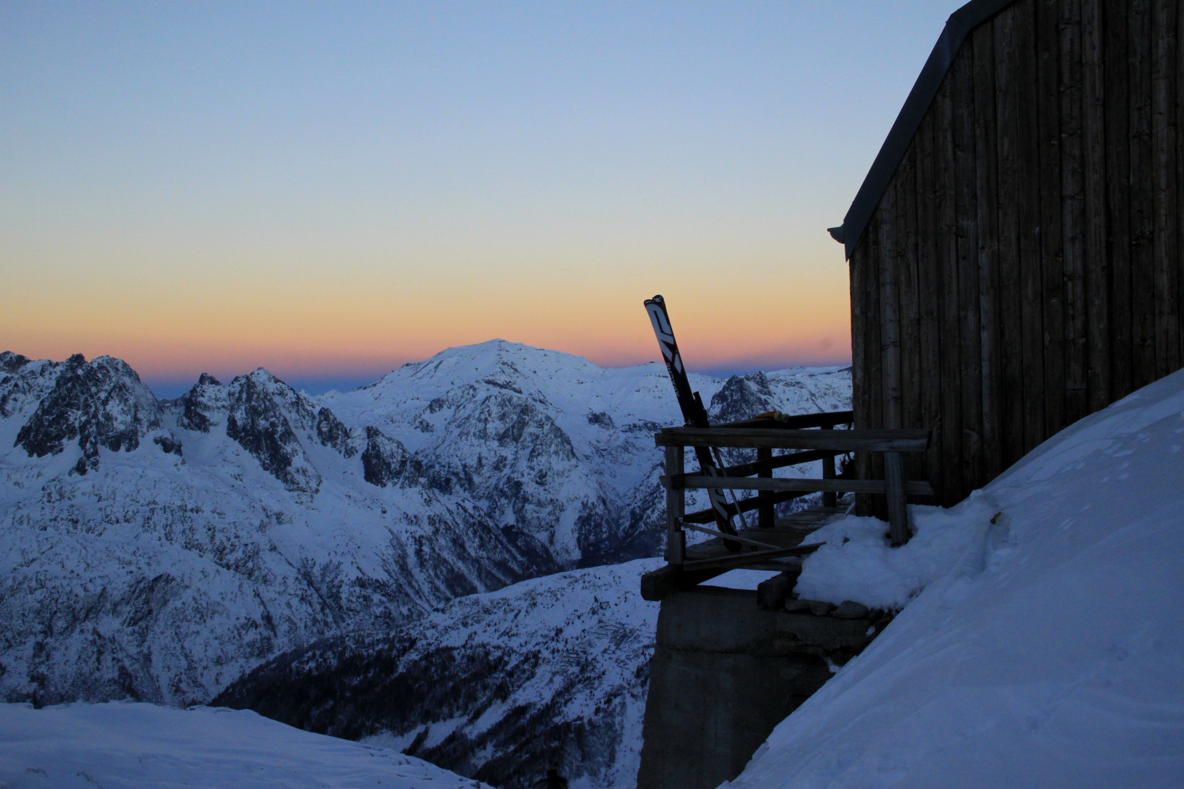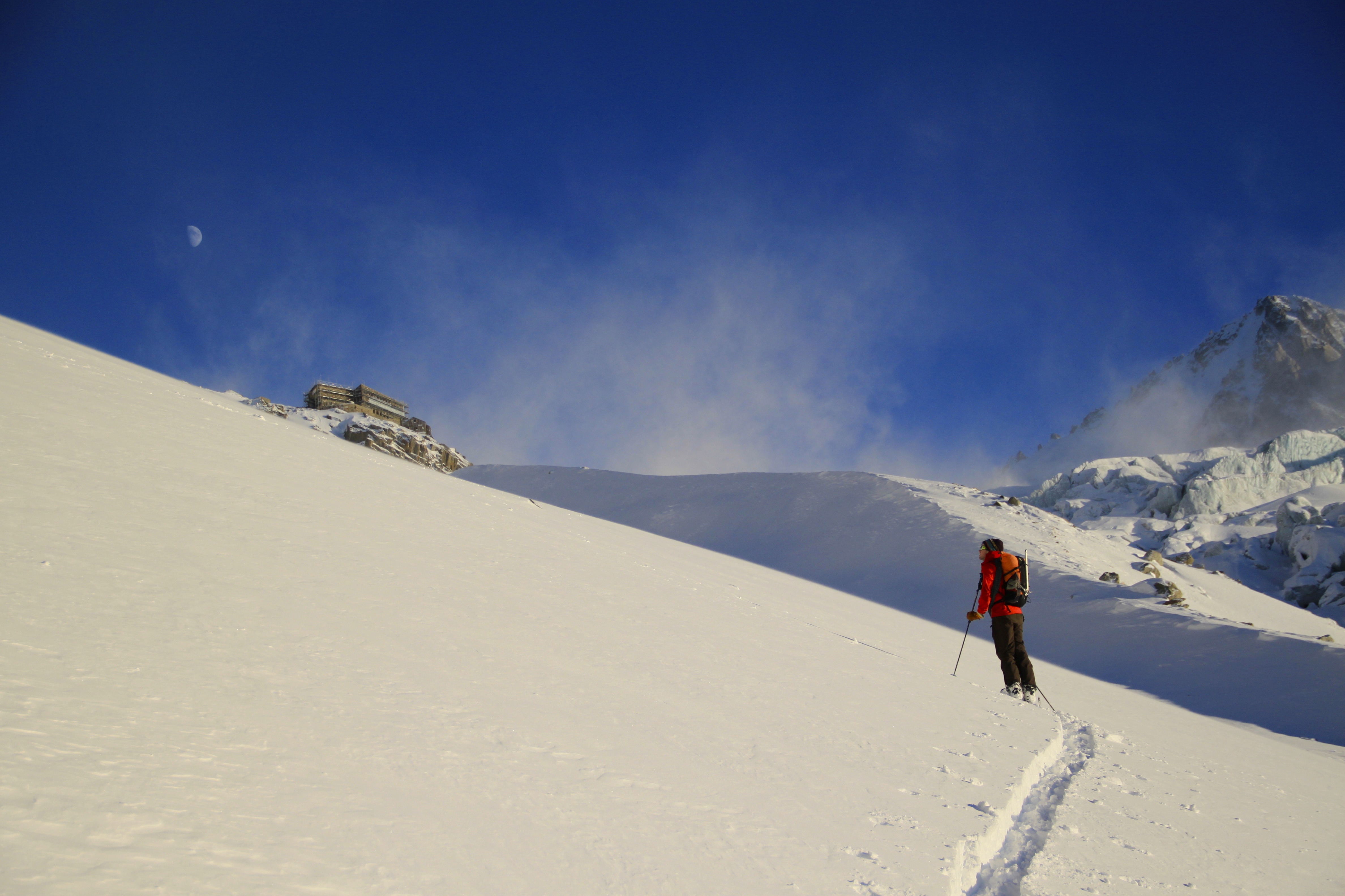 Skinning up the moraines we were going through some really nice powder that hadn’t been affected by the wind. We finally had the refuge in our sights and we were running out of sunlight, luckily we had the moon to guide us. We made it to the refuge at 5:30pm, 6 hours after setting off and skinning the last 300m with the sun setting behind us.
