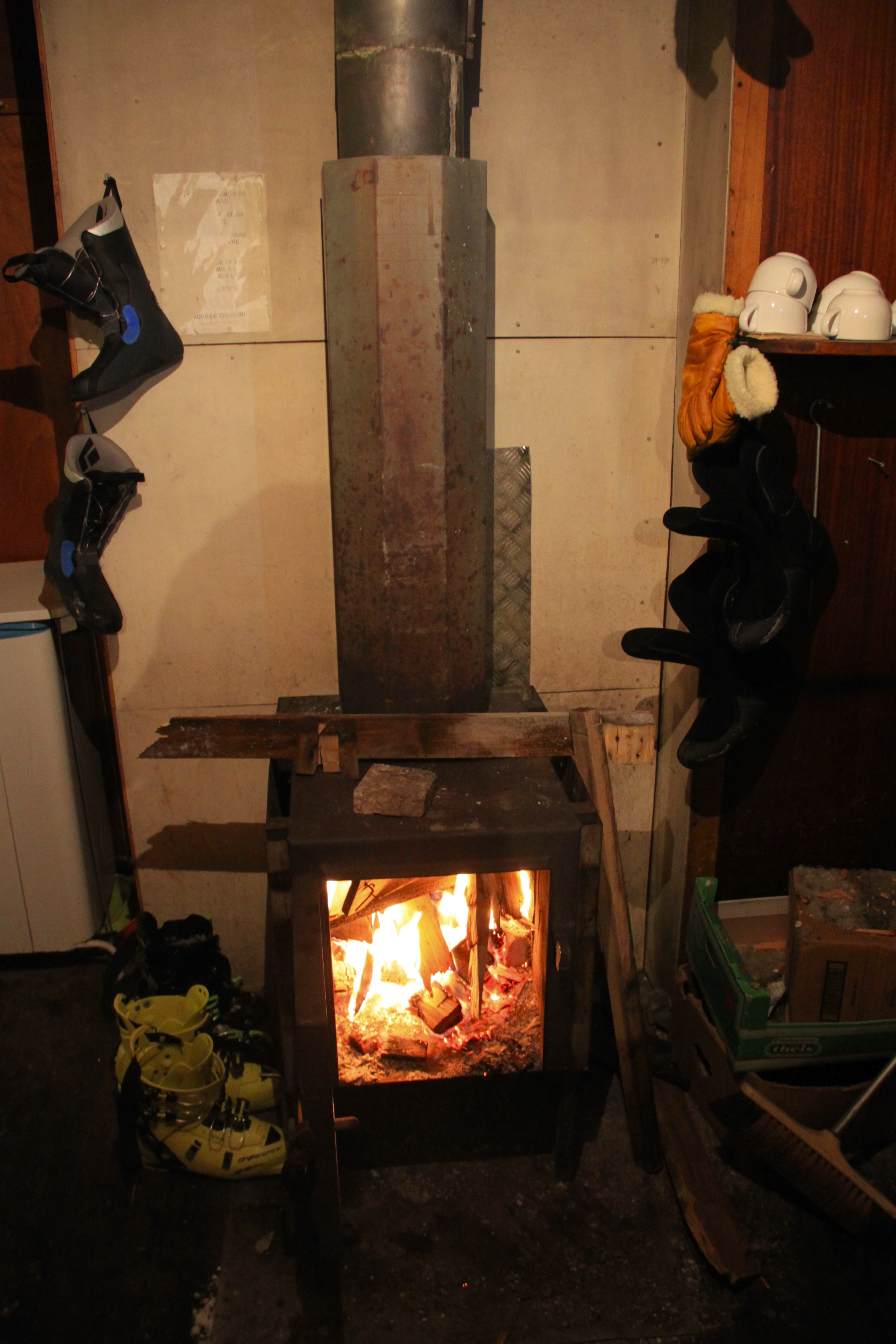 Drying our snow soaked gear by the roaring fire.
