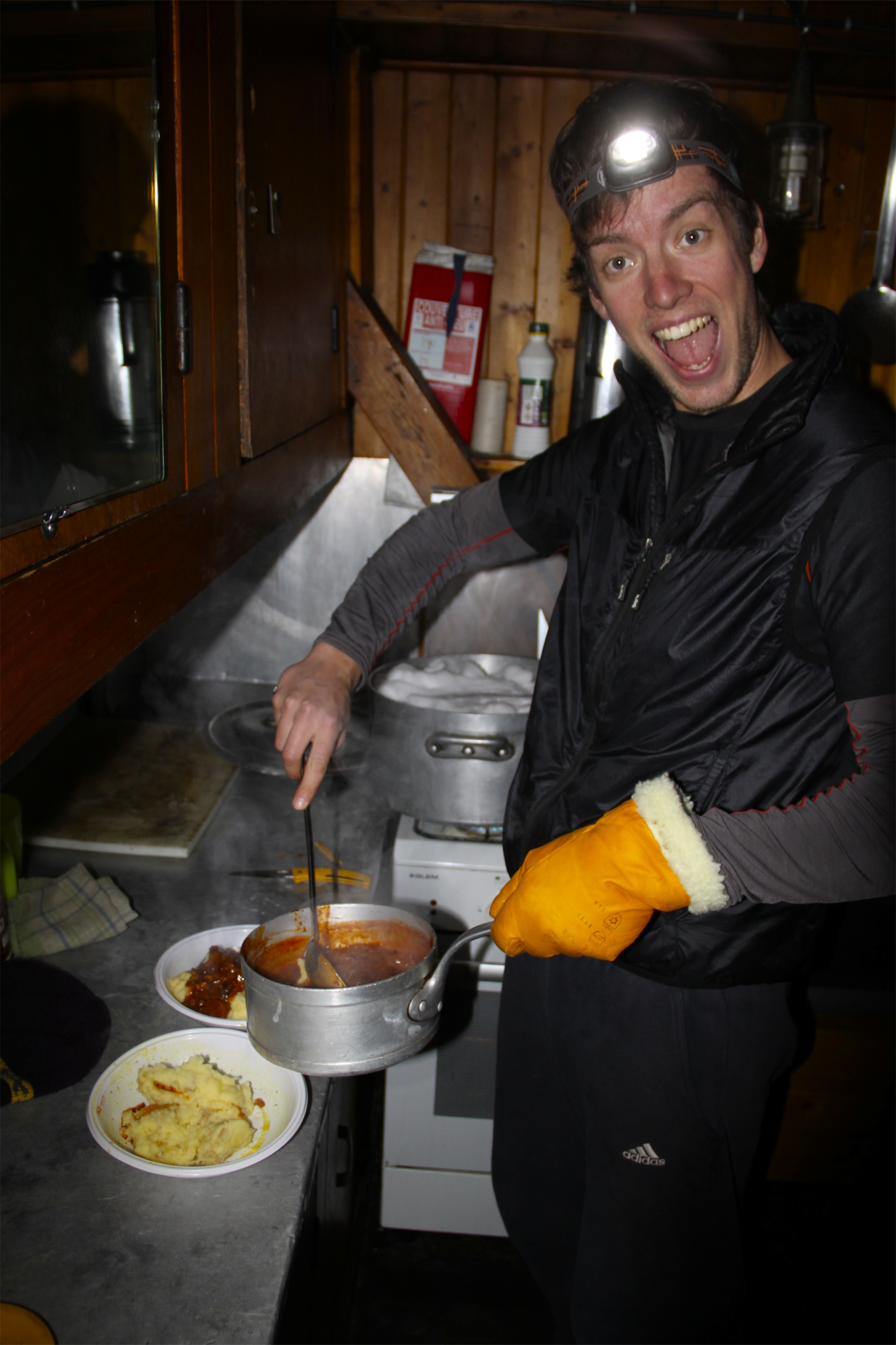 Upon arrival to the winter room at the Albert Premier we realised we had the whole place to ourselves and the builders who had previously occupied it had gone away for the bank holiday weekend. We quickly found some pallets and smashed them up and had the fire going and some snow melting. There was a working gas cooker and electricity there. The radio was playing and we found some wine, it was cold and old though so it didn’t go down very well! When I found some oven chips in the freezer we turned on the electric oven and tripped the whole building! That was the end of that! Head torches were on now and we started on dinner. Pasta starter then some Chilli and mash potatoes that we borrowed from the builders’ fridge!