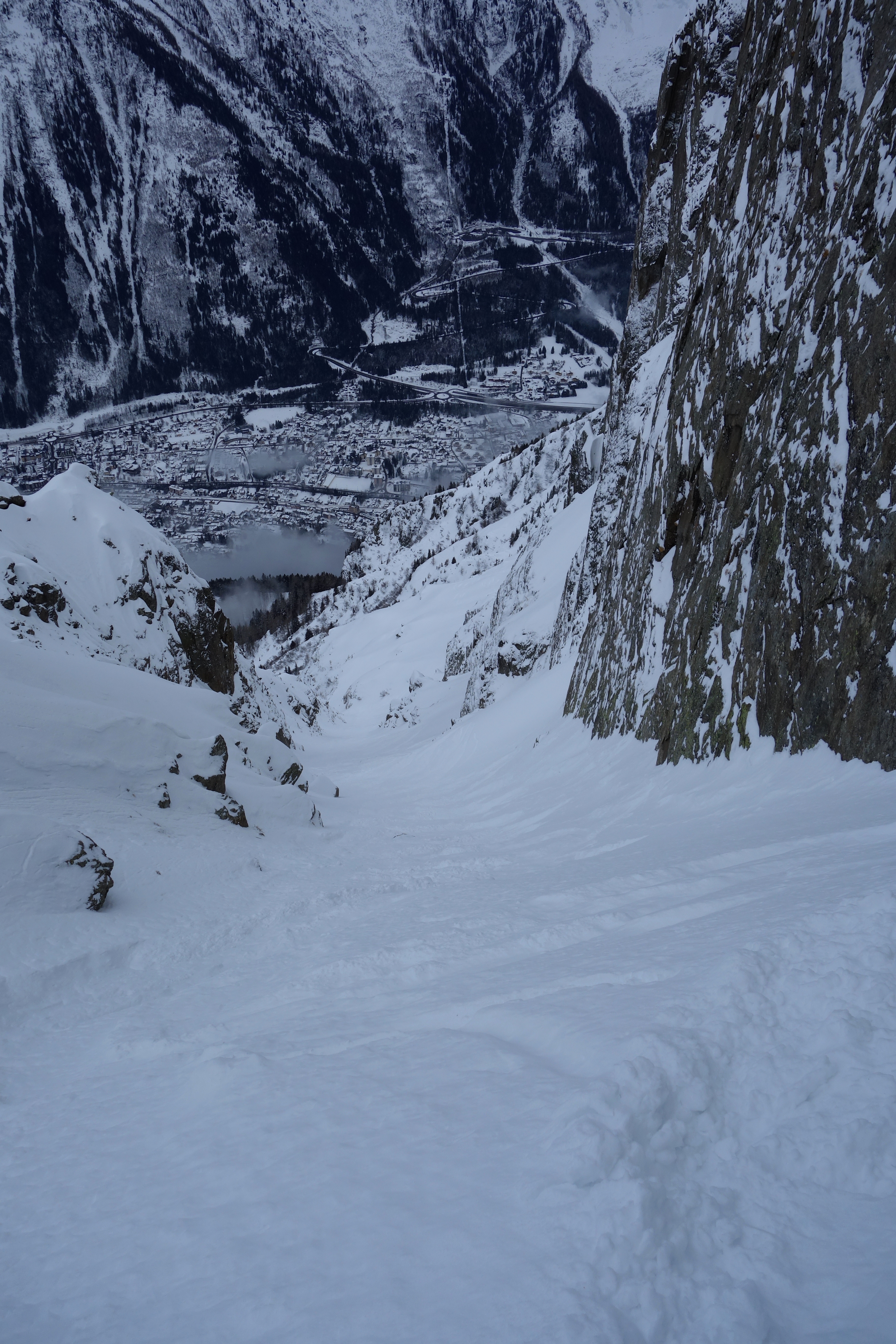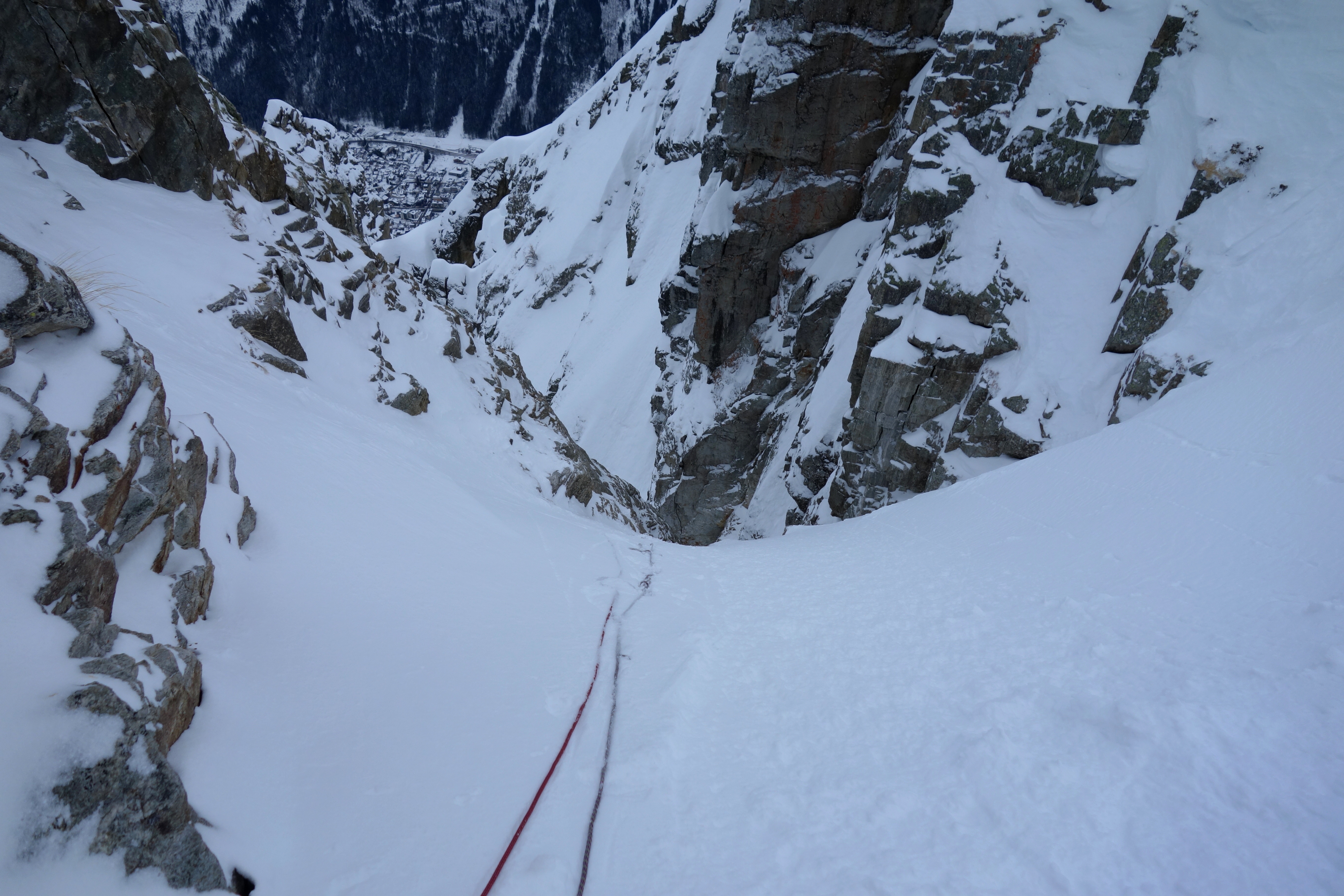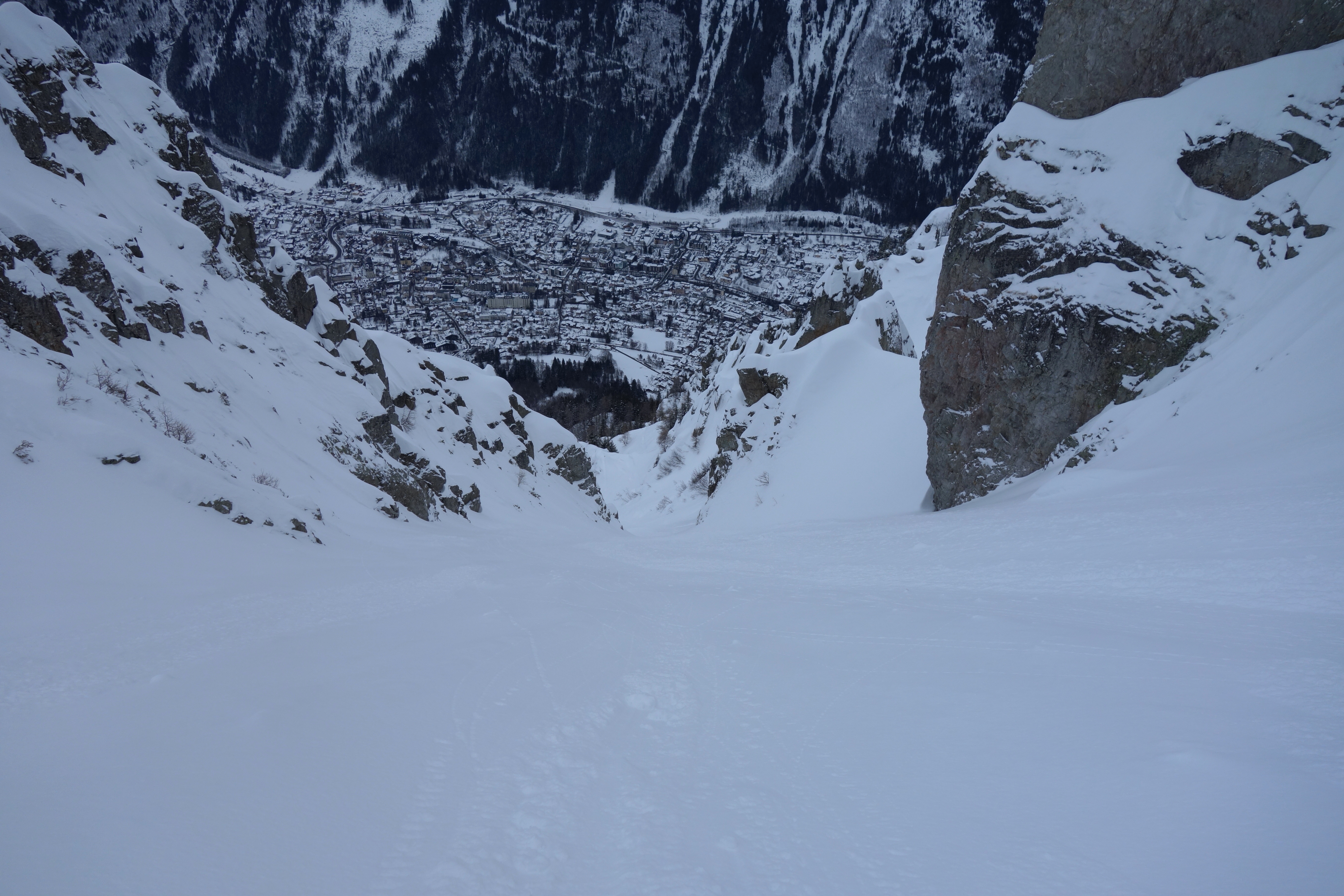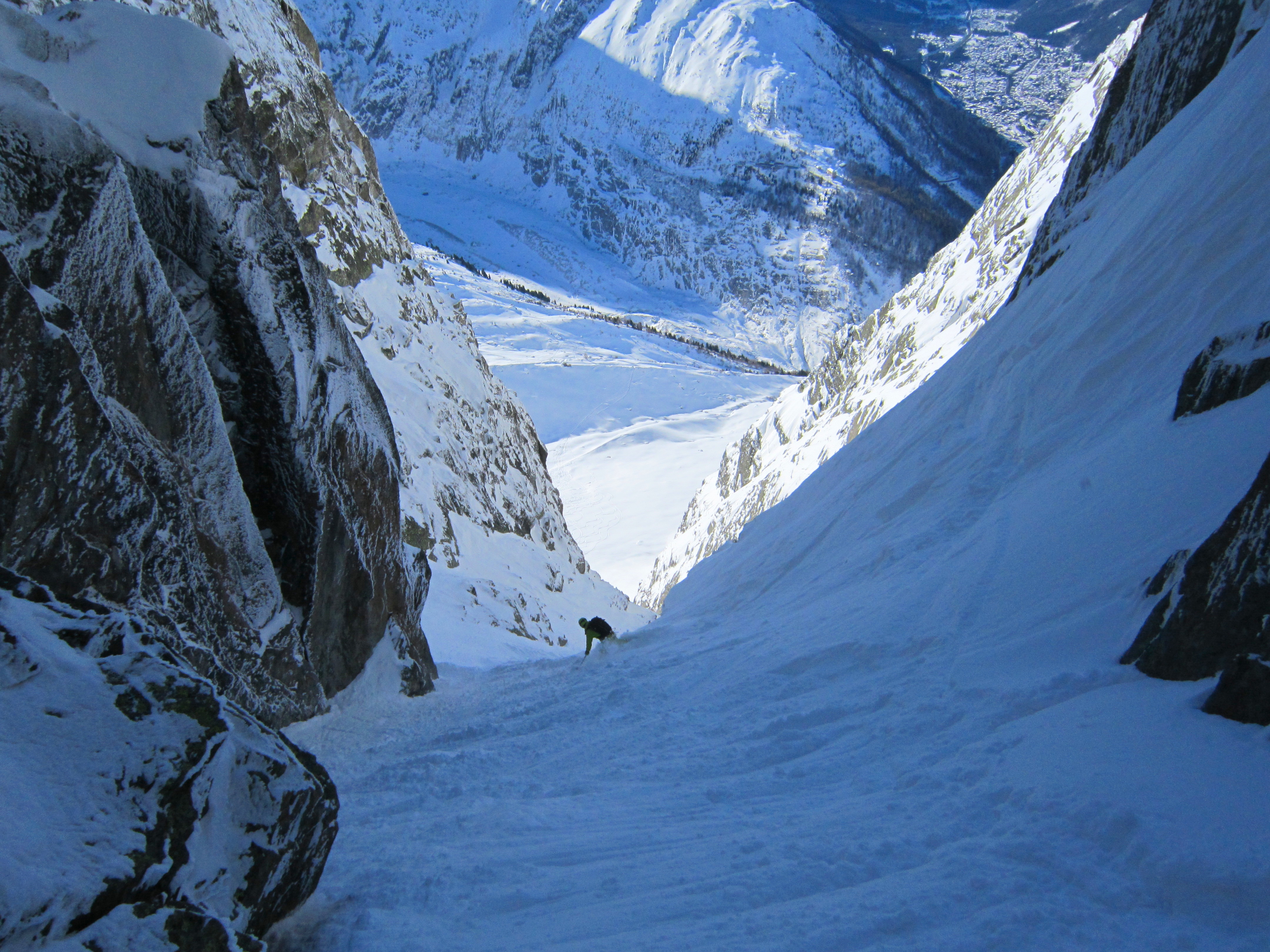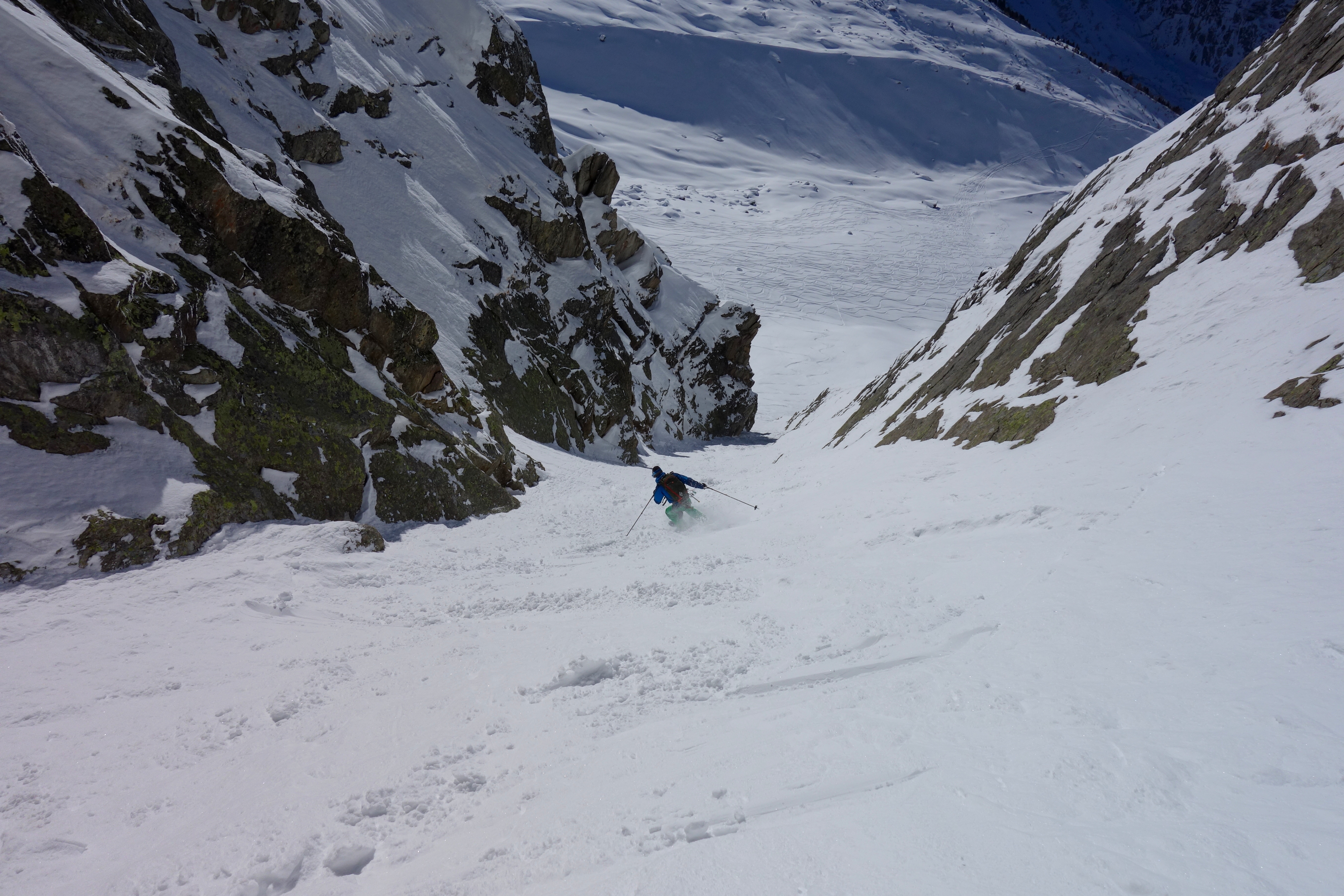 After exiting the couloir you are still in a reasonably dangerous place. The Dru is towering above you and there are hanging seracs pointing down on you so we had to move fast. The snow on the lower part of the Pas du Chevre was still soft and untracked but it did feel a bit wet. We had another few hundred meters of descent before joining the track to Montenvers. On this track is a short abseil, there is some in-situ rope but it is not quite long enough to get you over the ice underneath, as one Swede found out climbing back up and asking us to use our rope! A quick 15m rap and your past this difficulty and heading down the rocky chutes towards the glacier. Another day and another 420 steps back up to the train! What a week it has been, 4 days and 4 amazing couloirs. More snow forecast for the weekend so lets see what next week brings!