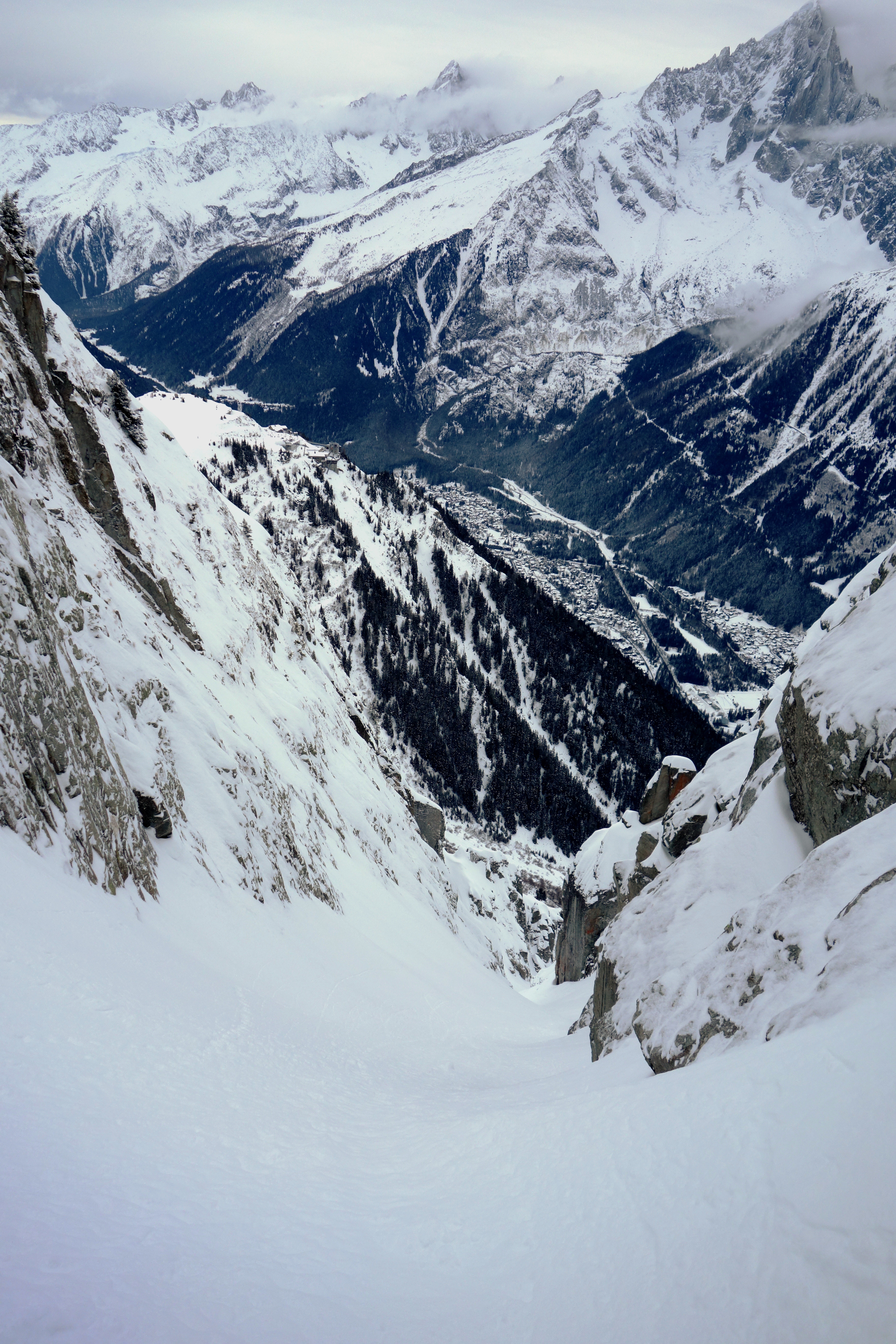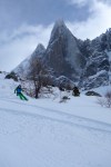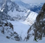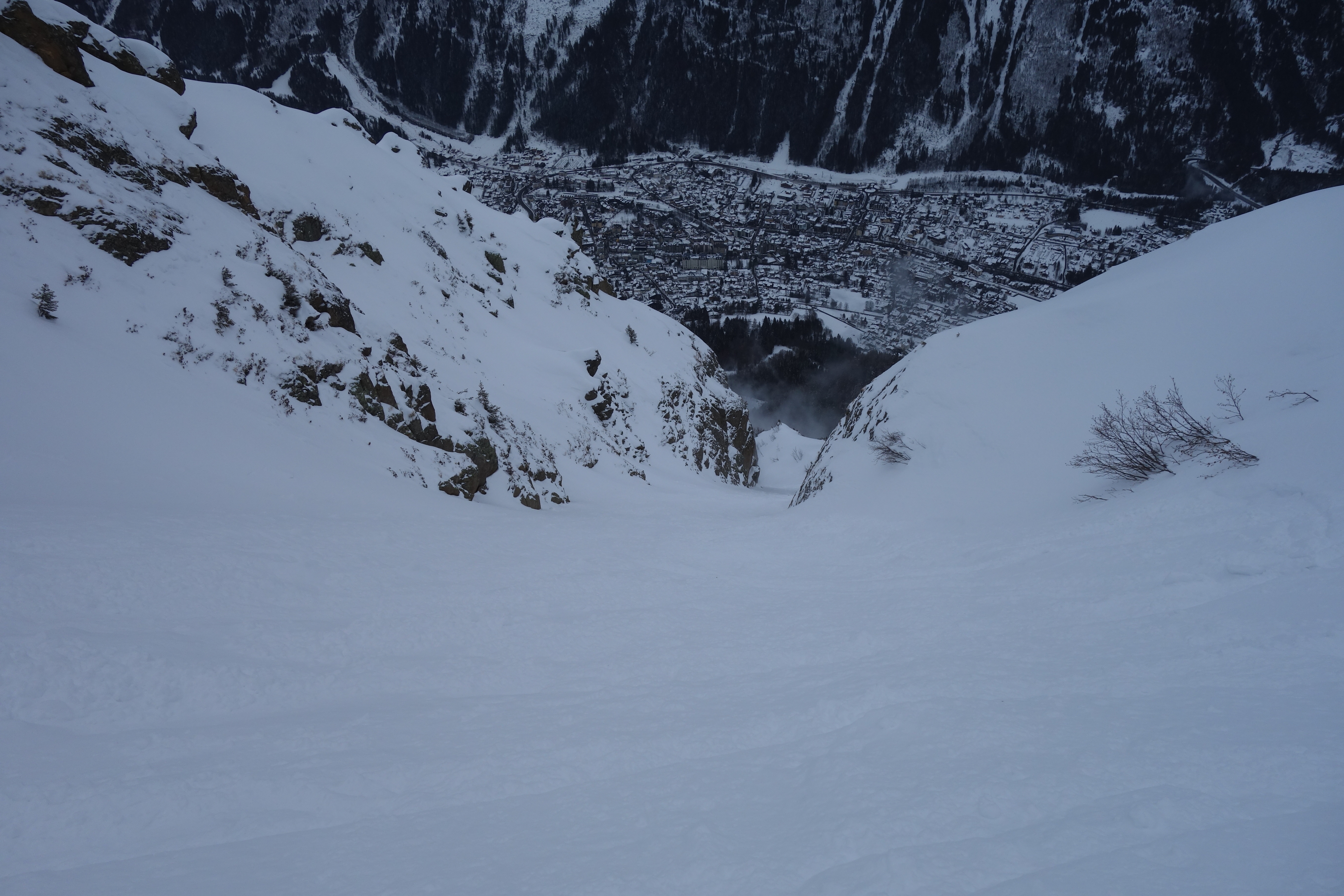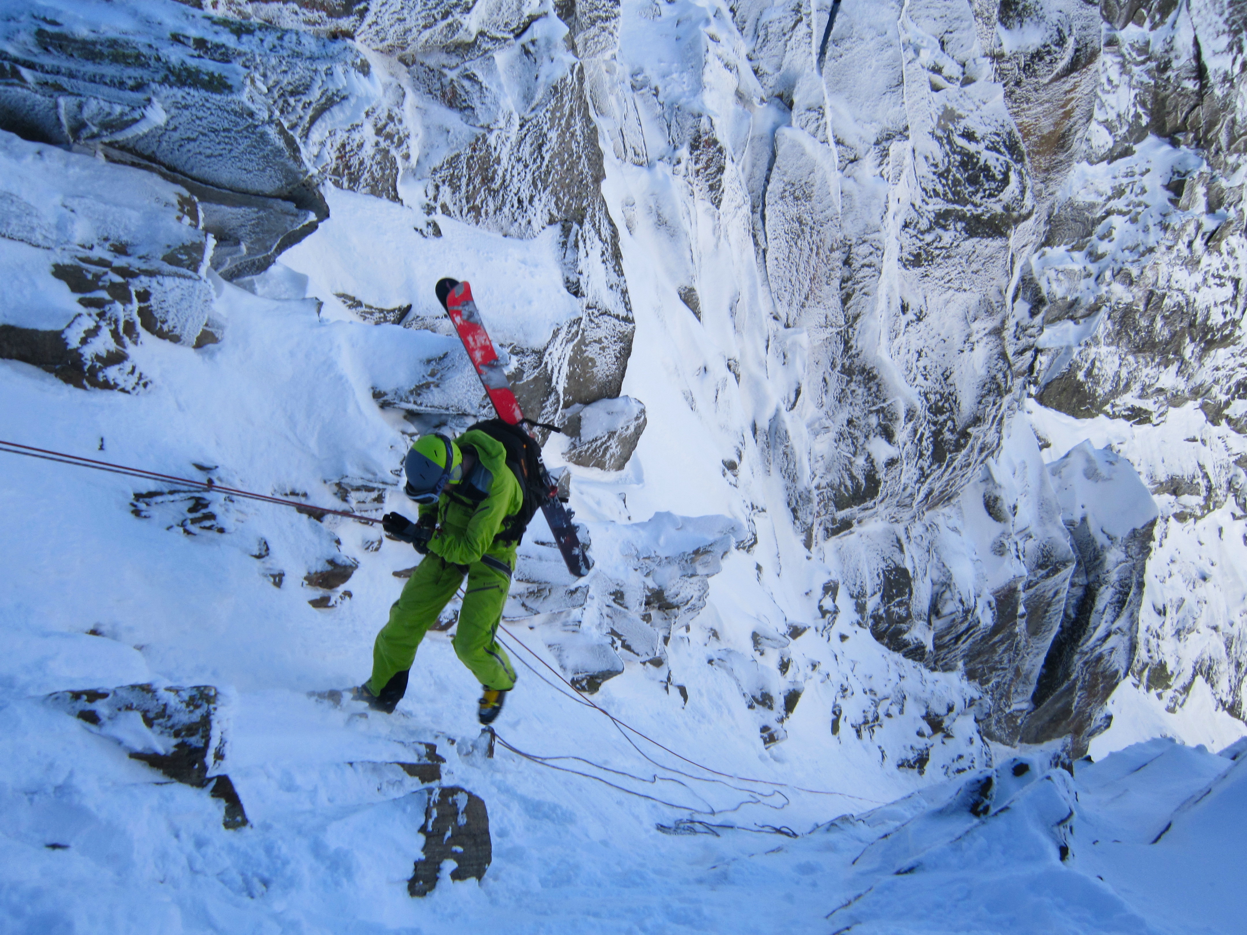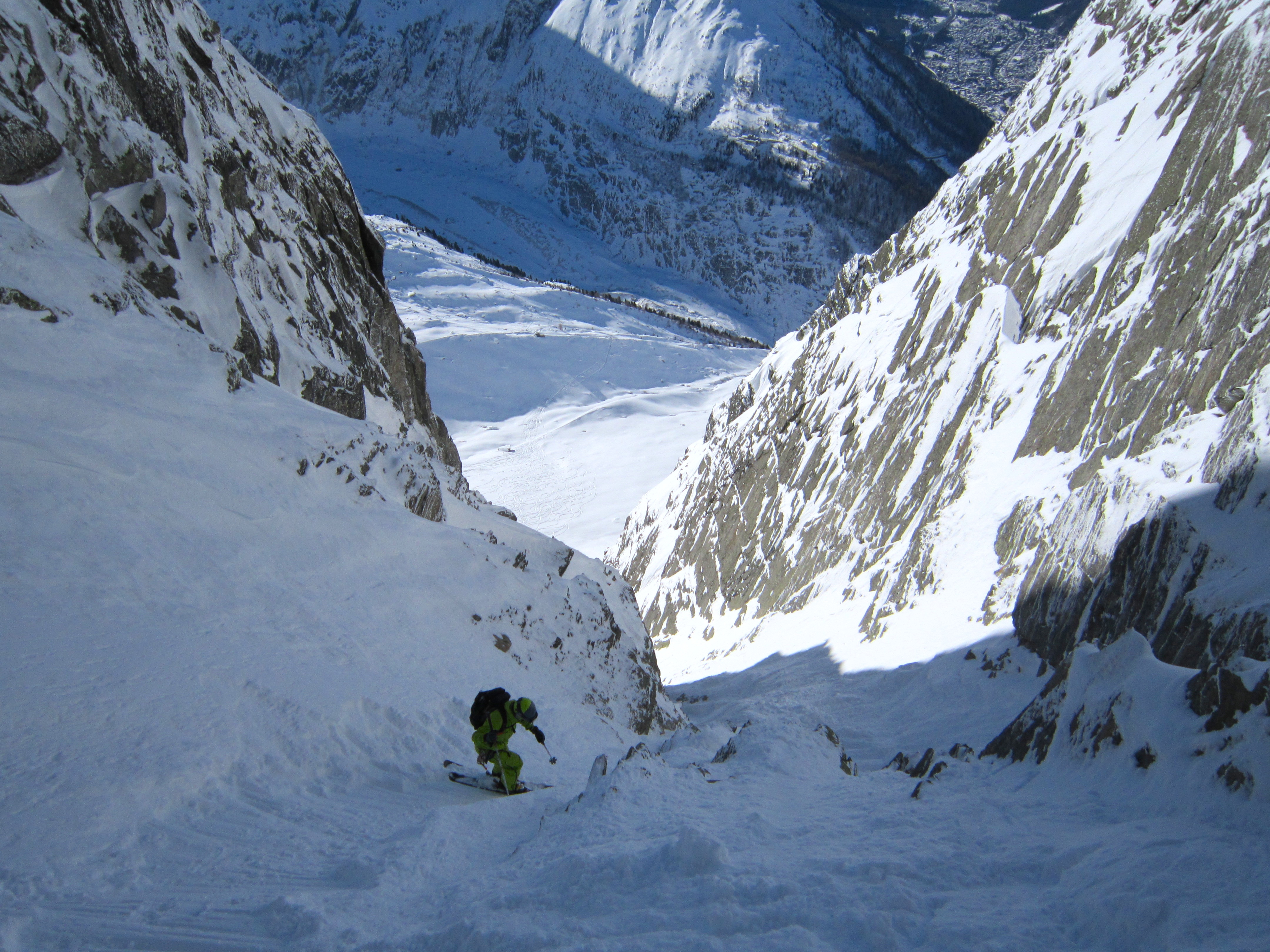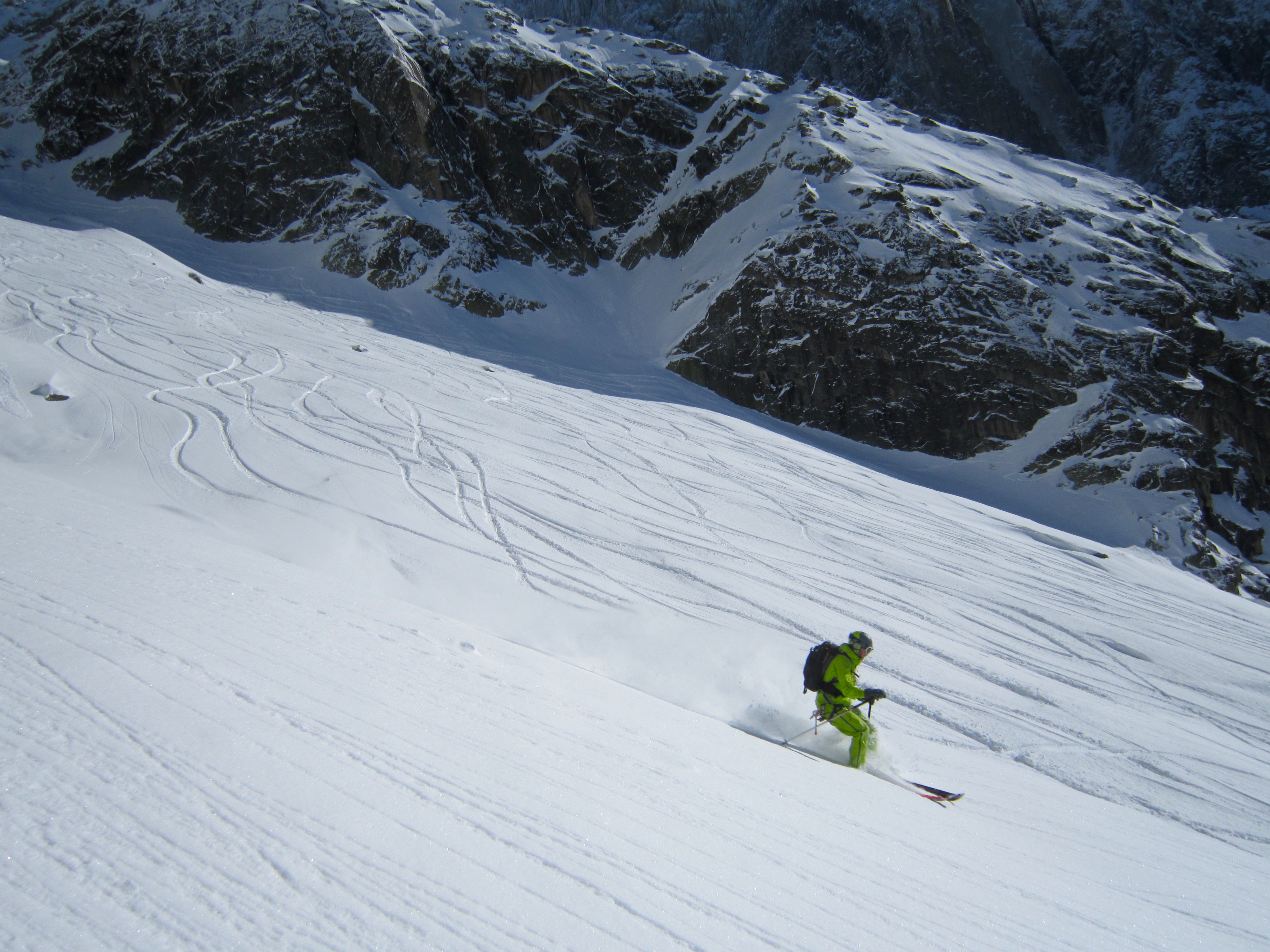 After exiting the couloir you are still in a reasonably dangerous place. The Dru is towering above you and there are hanging seracs pointing down on you so we had to move fast. The snow on the lower part of the Pas du Chevre was still soft and untracked but it did feel a bit wet. We had another few hundred meters of descent before joining the track to Montenvers. On this track is a short abseil, there is some in-situ rope but it is not quite long enough to get you over the ice underneath, as one Swede found out climbing back up and asking us to use our rope! A quick 15m rap and your past this difficulty and heading down the rocky chutes towards the glacier. Another day and another 420 steps back up to the train! What a week it has been, 4 days and 4 amazing couloirs. More snow forecast for the weekend so lets see what next week brings!