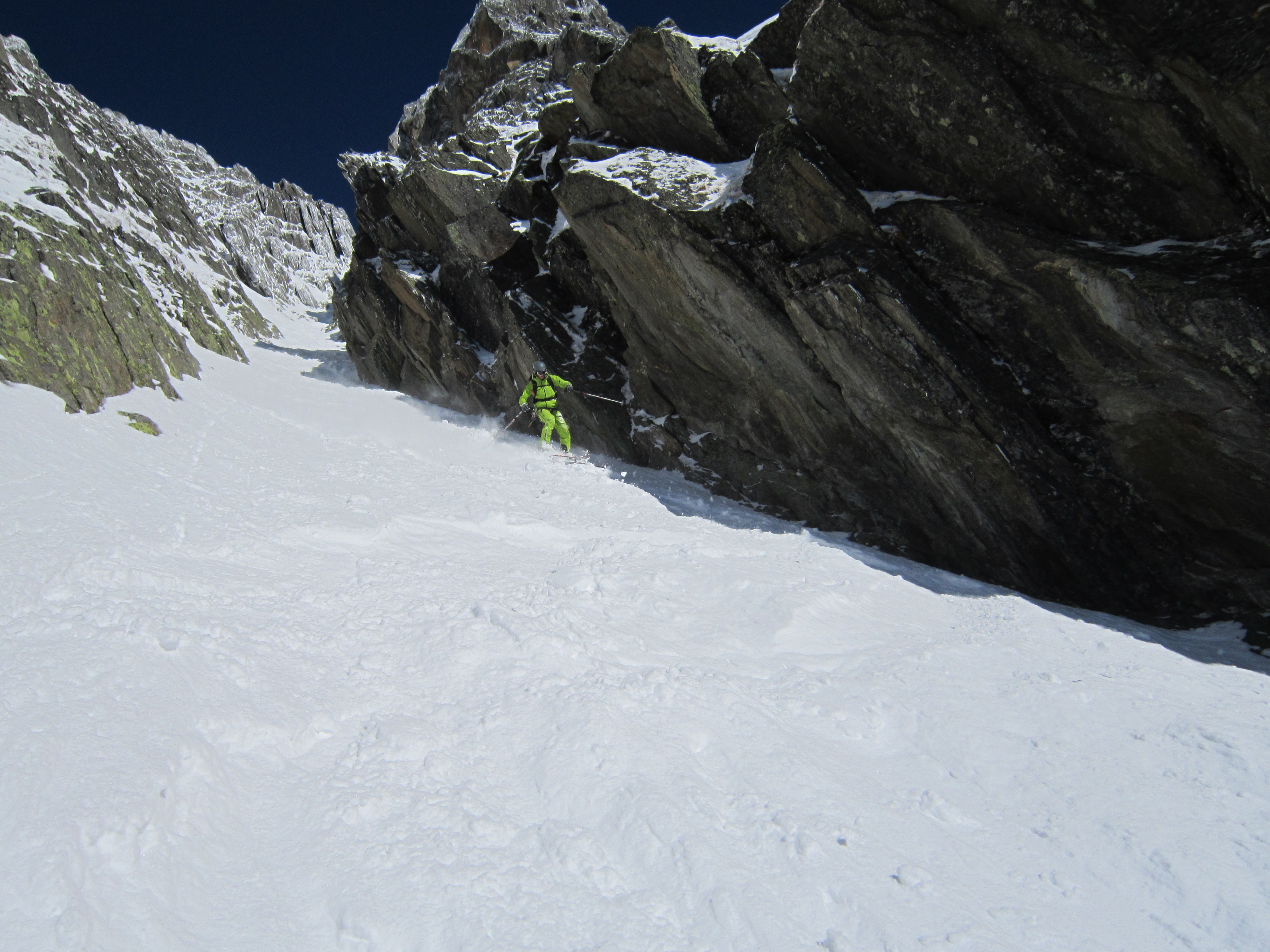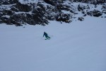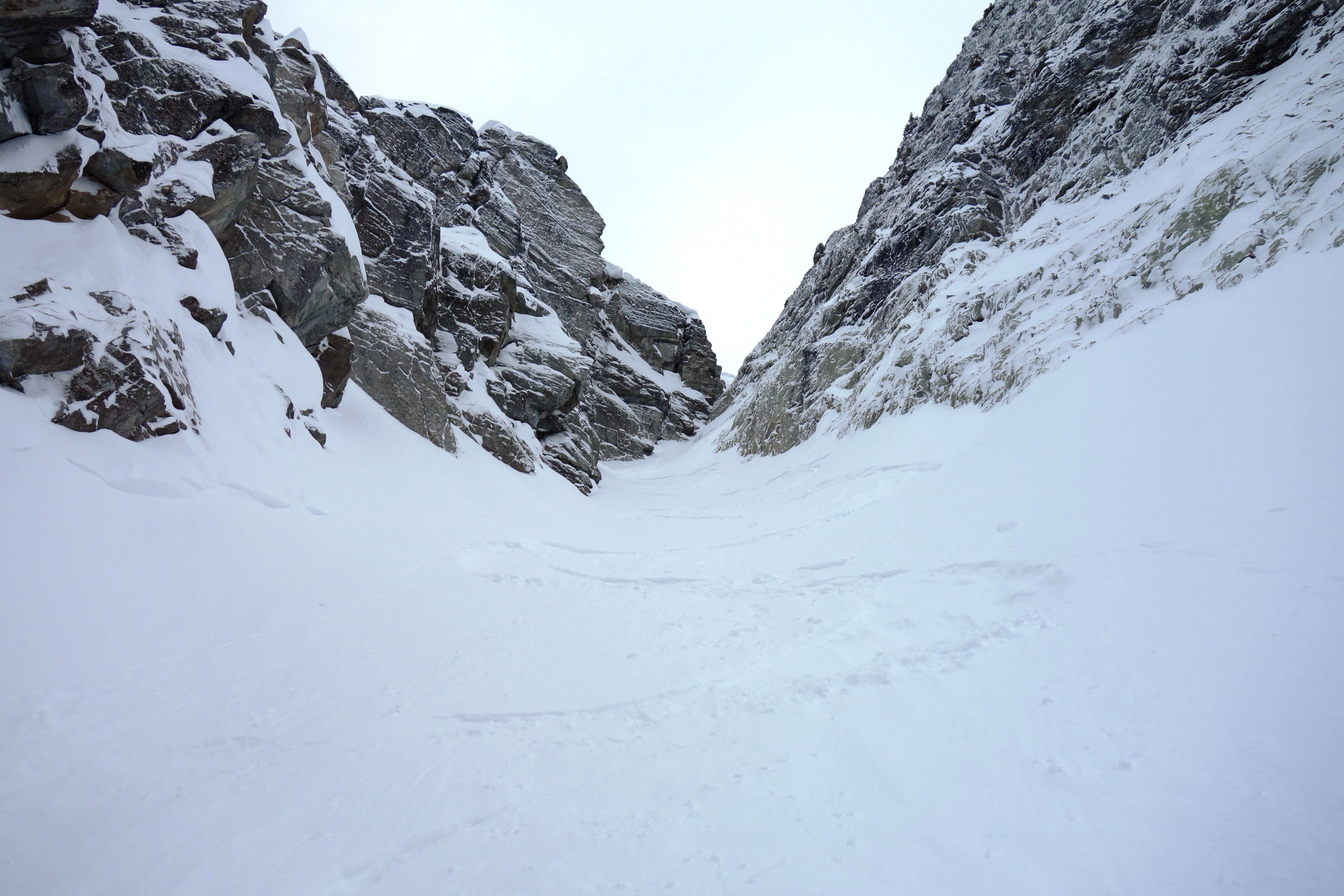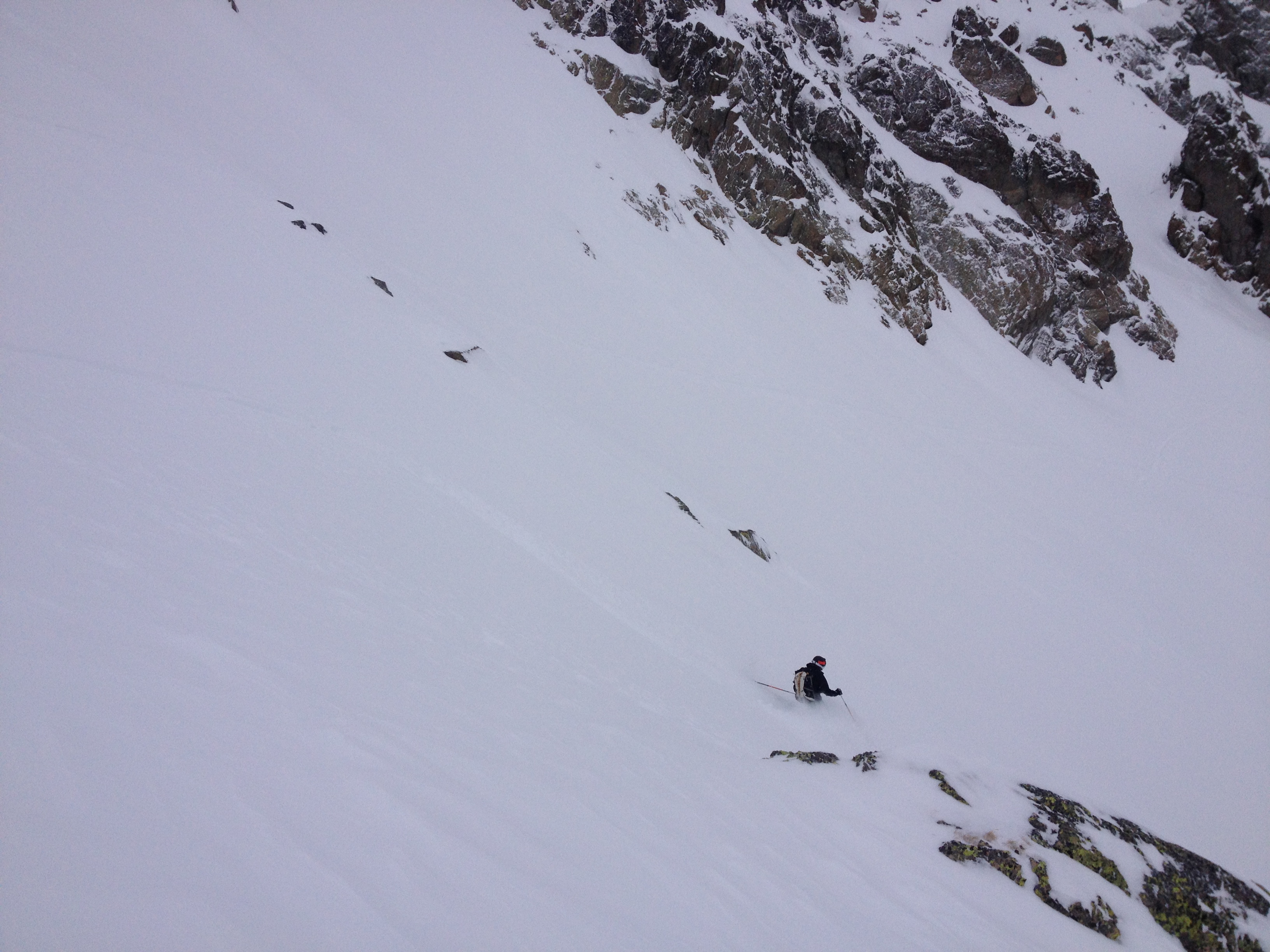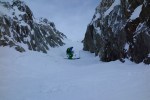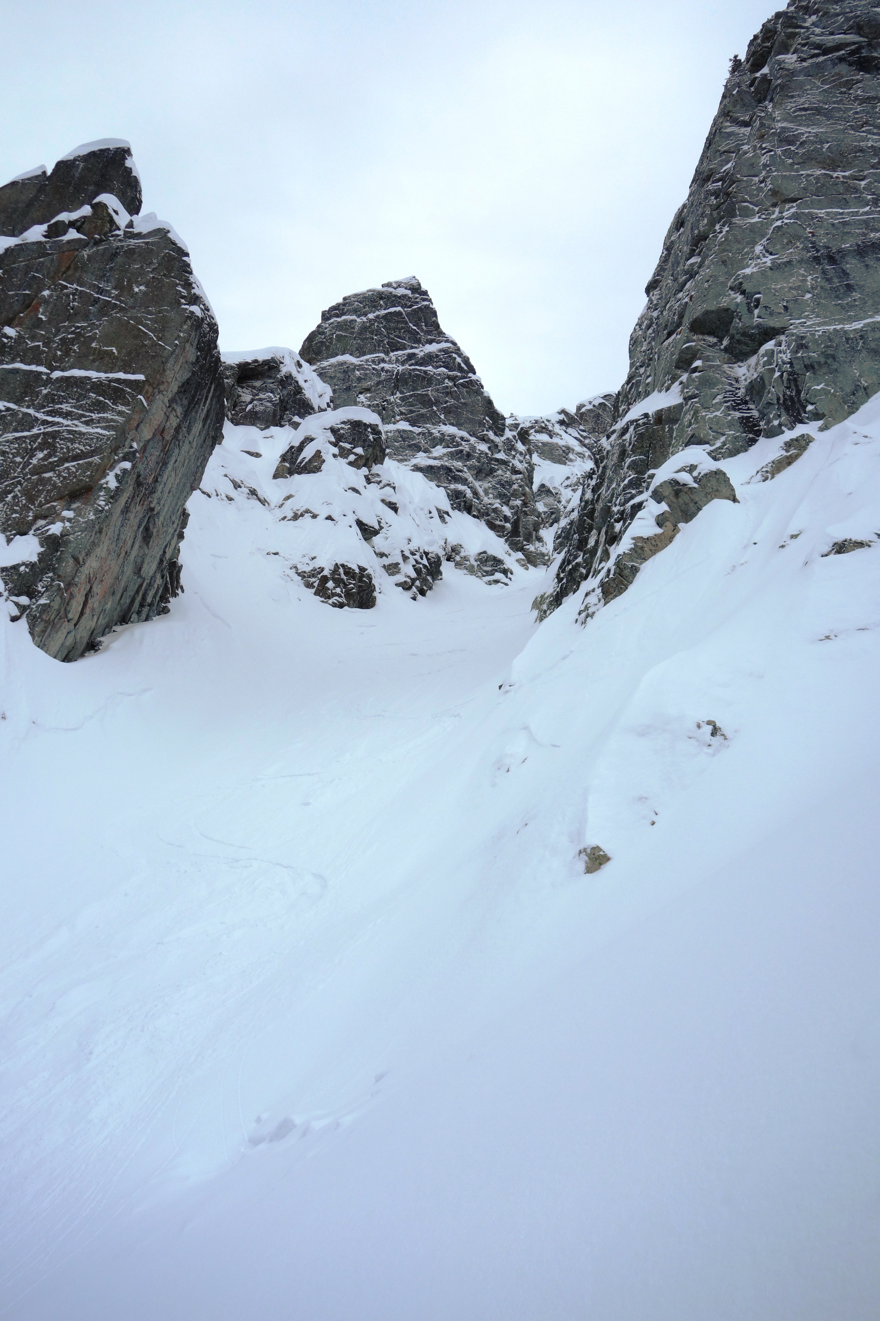 I was first with my skis on and while Ally was sorting out his kit I headed down to try and find the entrance as we only had a rough idea of where we were going. Upon finding it I saw that it was a narrow side slip for about 20 meters before you enter into the couloir. I started the slip without Ally so it would be free when he got there. After we got home he said he didn’t know where I was when he was looking for the entrance, only to hear the sound of skis on firm snow and rocks then followed the scratching to find me!