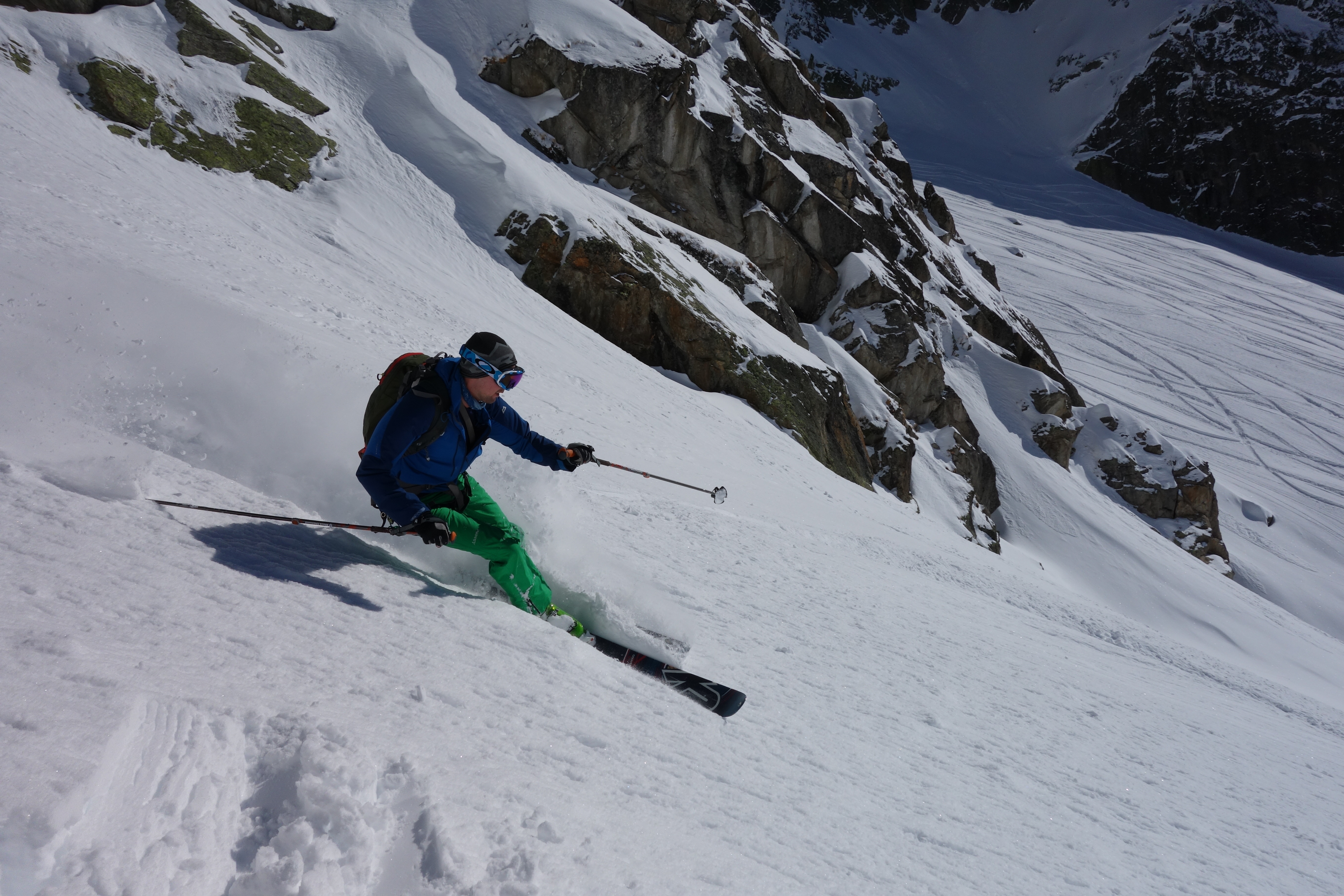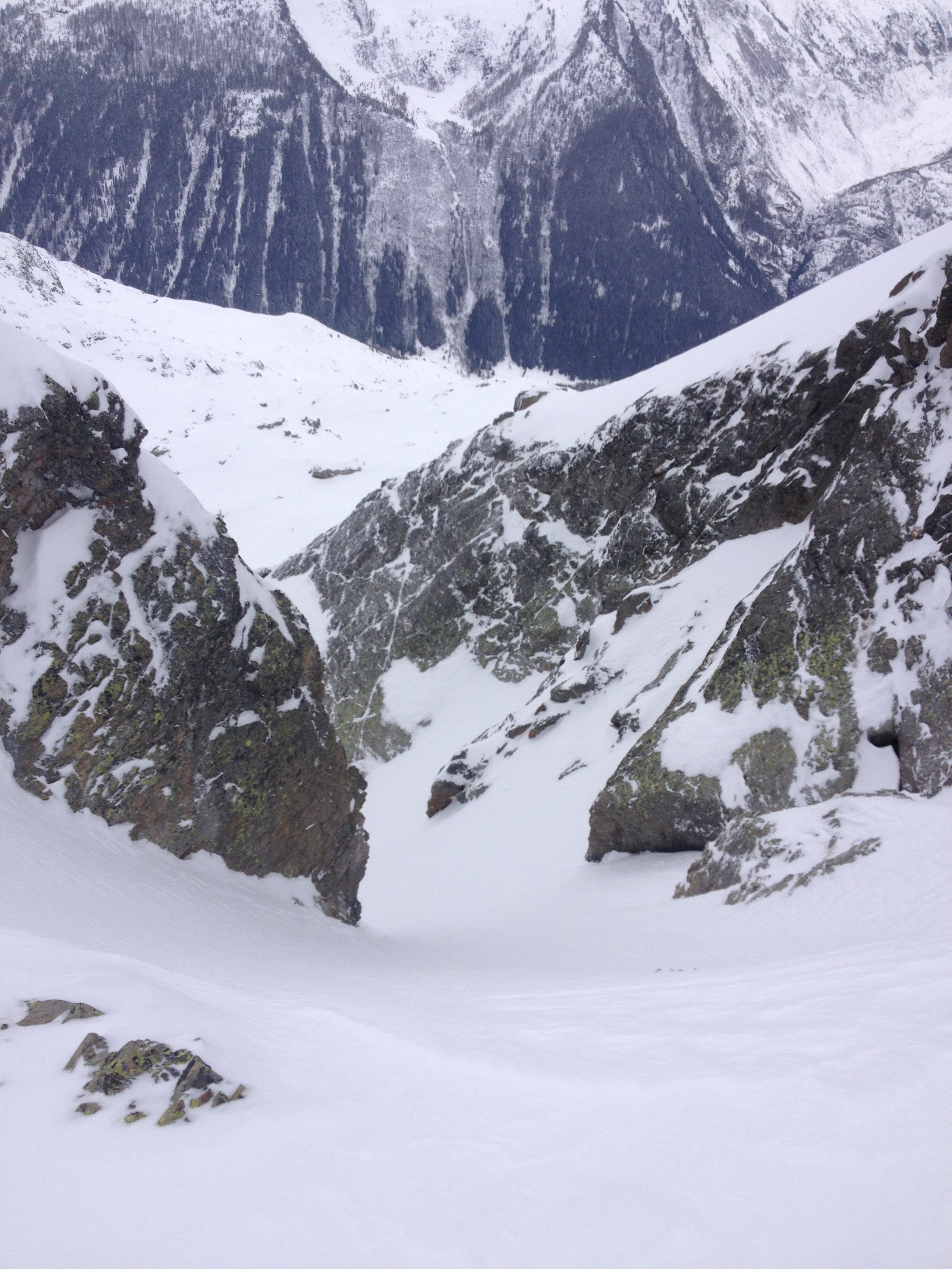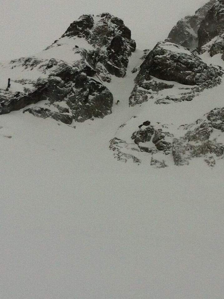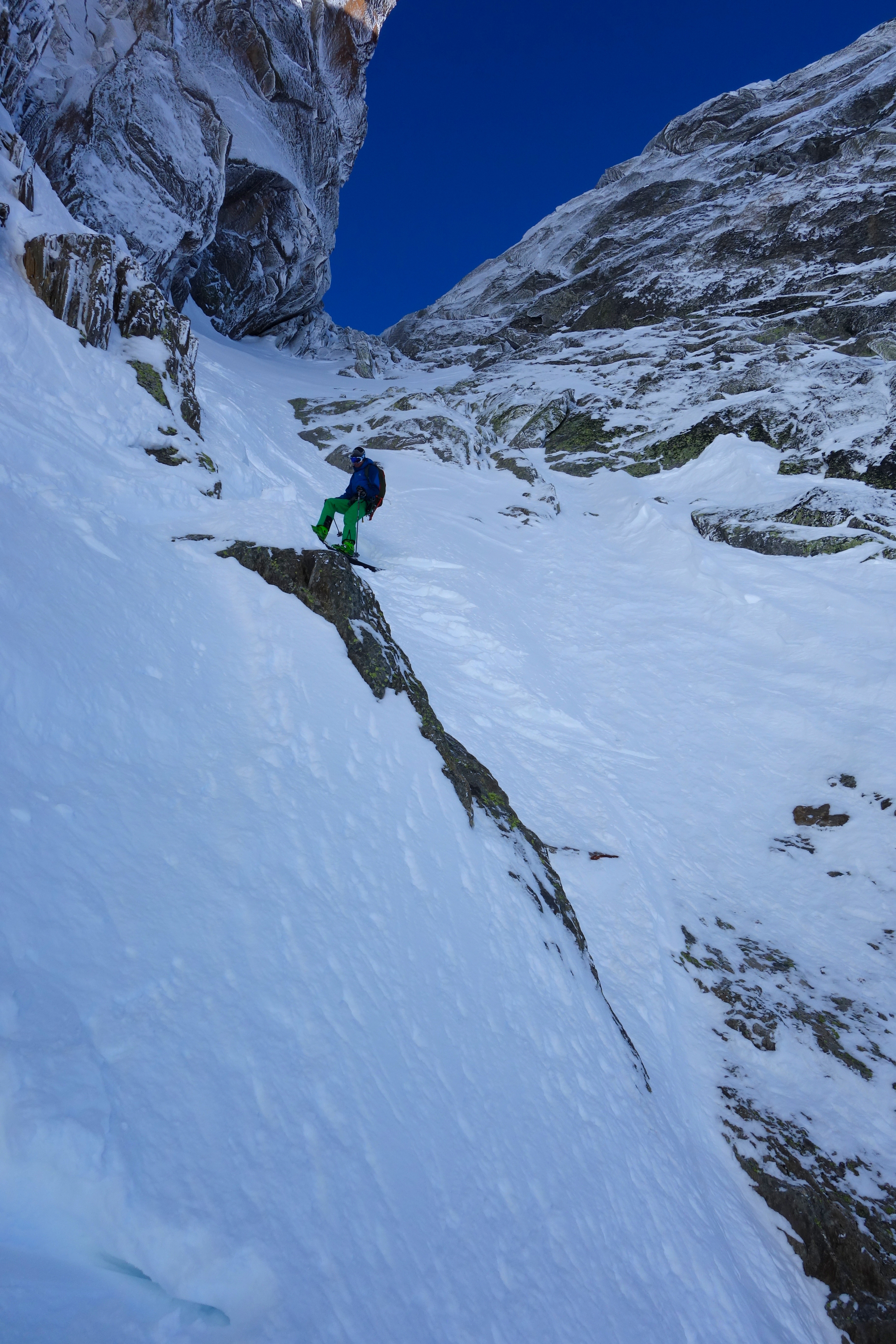 I was first with my skis on and while Ally was sorting out his kit I headed down to try and find the entrance as we only had a rough idea of where we were going. Upon finding it I saw that it was a narrow side slip for about 20 meters before you enter into the couloir. I started the slip without Ally so it would be free when he got there. After we got home he said he didn’t know where I was when he was looking for the entrance, only to hear the sound of skis on firm snow and rocks then followed the scratching to find me!