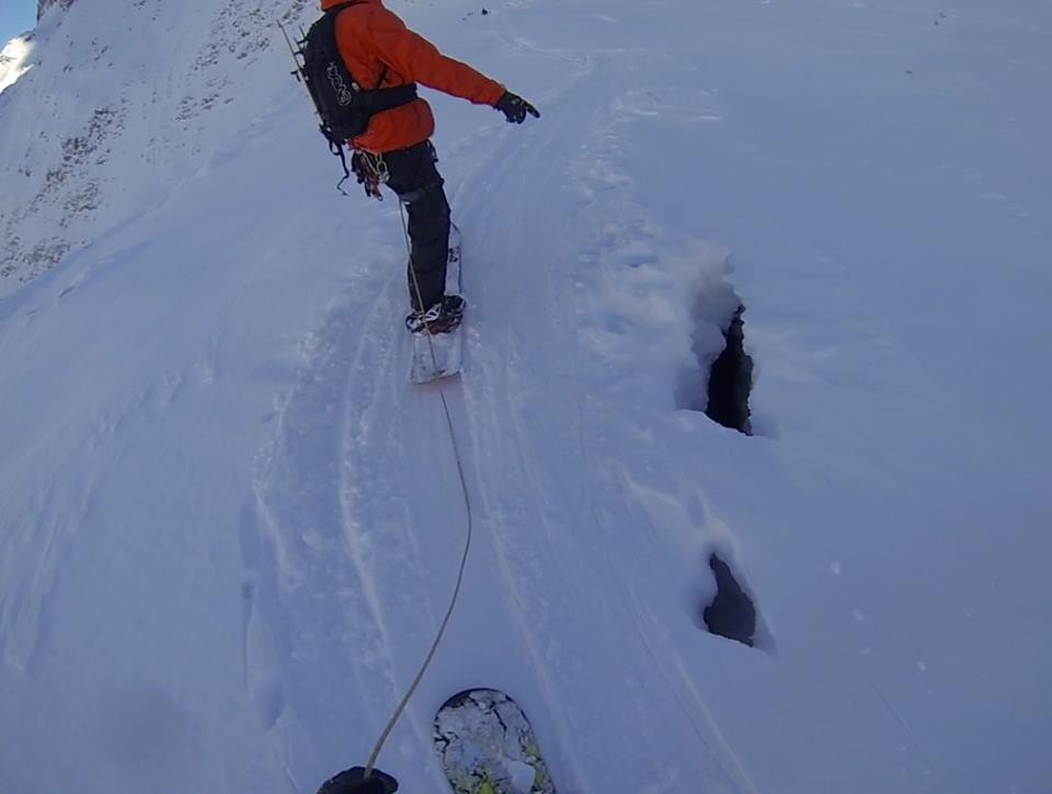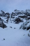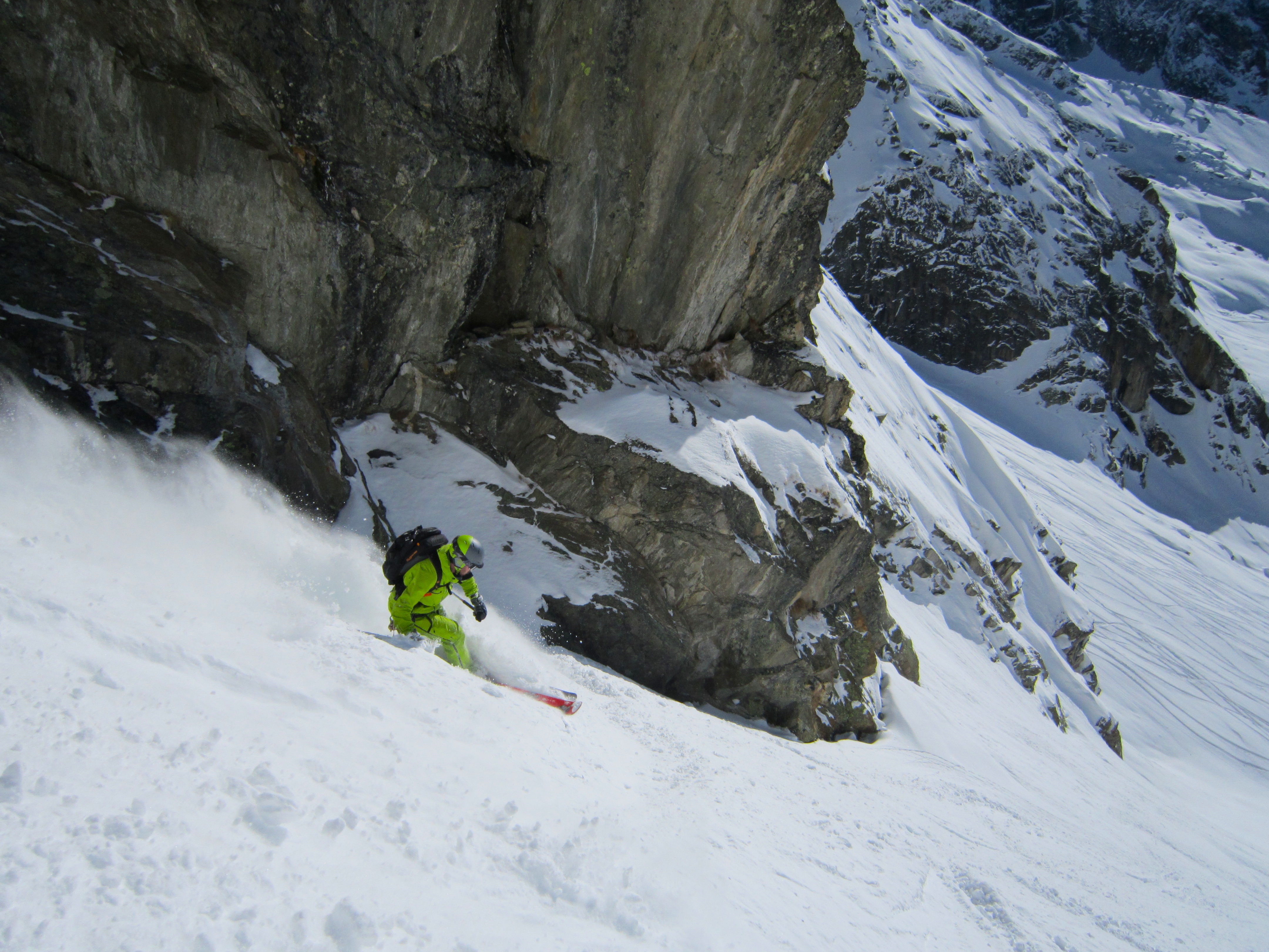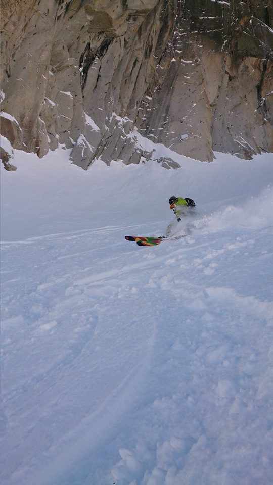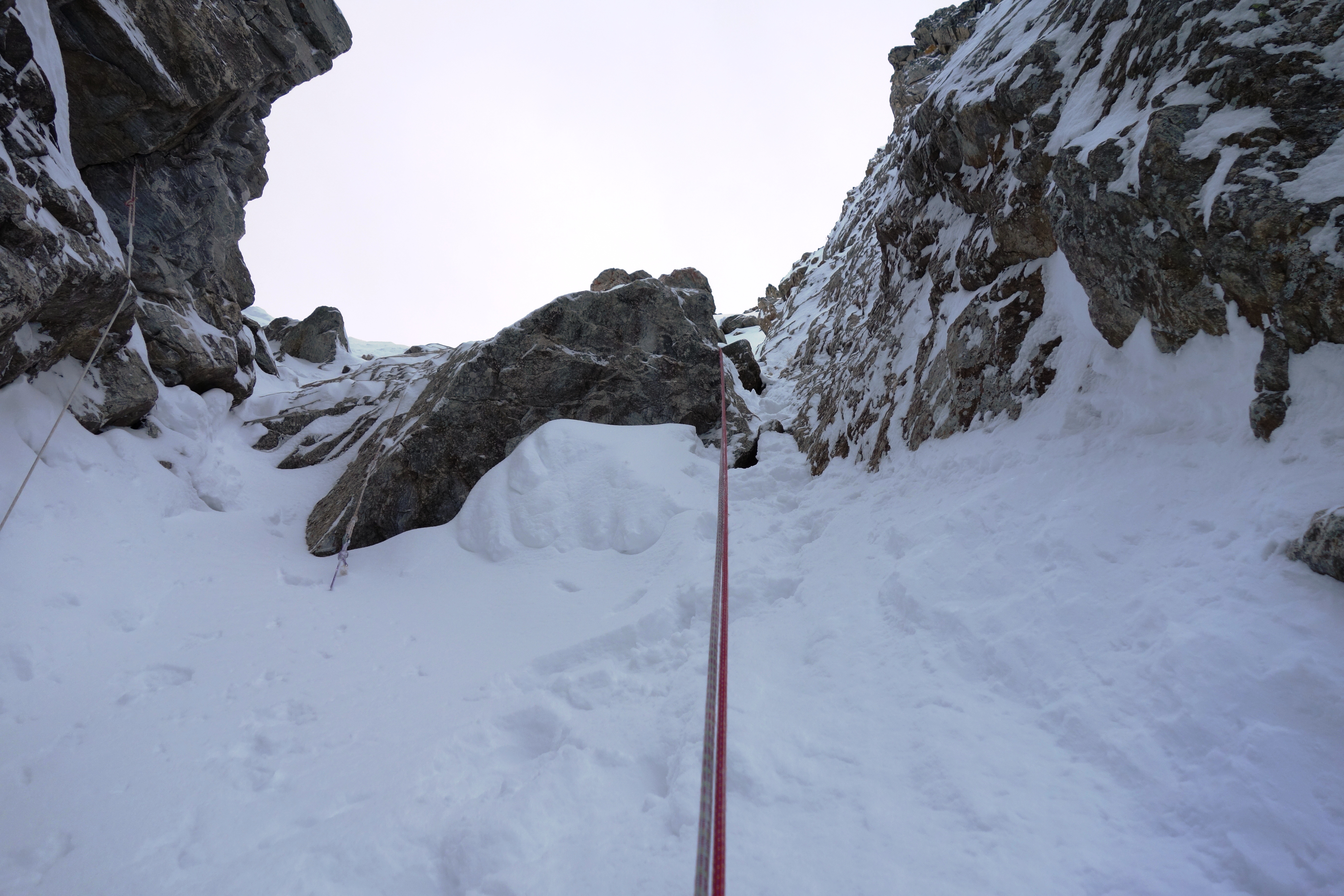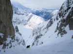 I was first with my skis on and while Ally was sorting out his kit I headed down to try and find the entrance as we only had a rough idea of where we were going. Upon finding it I saw that it was a narrow side slip for about 20 meters before you enter into the couloir. I started the slip without Ally so it would be free when he got there. After we got home he said he didn’t know where I was when he was looking for the entrance, only to hear the sound of skis on firm snow and rocks then followed the scratching to find me!