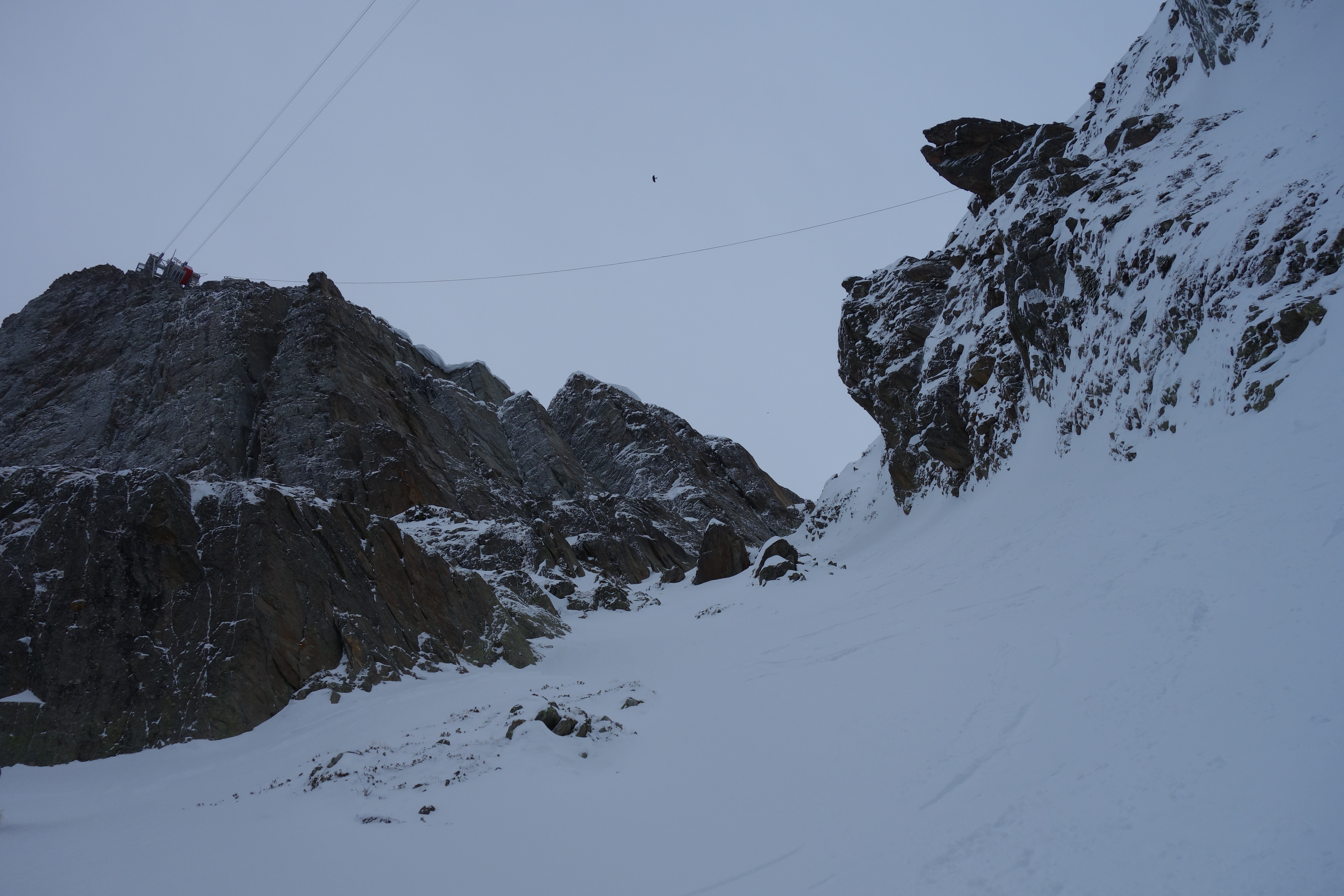 After much debate and a cup of tea I agreed to go and Ski the Couloir Rectiligne which is accessed from the top station of Les Grand Montets. I knew it would be tracked out but having not done it before I was still super keen. Heading up to Argentiere on a bus about 9:15 we were straight in the queue for top ticket which was only about 15/20 minutes, got to love quiet season!