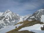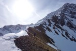We could see tracks coming from the top and they looked good. With no signs of big sloughs coming down we headed up with light bags after stashing our gear just over the bergschrund. There was some evidence of a bootpack still there but we (Dave) mostly had to make a new one. Half way up the slope we were joined by a lone Frenchman Boris, who accompanied us to the top and enjoyed the descent with us. Near the top you make a traverse to the right and into the sun. Reaching the col my nerves were peaking and I knew what I had to do to get back down safely.