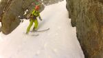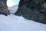 With my skis on I felt a little safer and started to realise what I was about to do. The first turn took about 5 attempts; Building up the strength and courage on steep exposed lines is different for everyone. For me turning from right to left is strongest but I had no option here. Making that first turn was a big moment for me, my tiny little 82mm Dynastars gripping the very firm upper section and reassuring me that I was not going to slide down this couloir upside down. A few more turns came and went before I came into a rocky section that had been side slipped before. Taking the axe back out for a little safety I was clear of the obvious rocks and had over 150m of nice spring chalk to enjoy. I put one headphone back in, turned up Sultans of Swing and linked some of the best fast jump turns I have ever made and was over the schrund in what felt like a few minutes. Looking back up at the couloir with my body still in one piece I let out a huge roar, I had done it and I loved every minute of it. The smile on my face was still as big as ever as I made my way down the horribly hard and wind blown valley blanche to the James bond track.