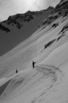A good couple of days spent in the mountains. Meeting Mikko at the lift for first bin we were already a couple of people short of our original 4 team so it meant more boot packing for the both of us. Heading over a very ominous looking bergschrund we started the boot pack up the NE Spur. Soon we were joined by Jose who came along with us and shared the effort. After being plastered by howling spindrift and heavy sluff for the most of the climb we came to the diagonal ramp about 2/3rds of the way up. Here the couloir narrows and the only way up was to climb through the heavy spindrift/ sluff that was puling down the face. We called it a day here. Strapped on our skis and enjoyed a great ski back down. At the bottom we crossed the bergschrund on a bridge that was not there 2 hours earlier when we started. Lots of moving snow!