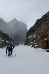 The snow was perfect despite the last 100m being a little crap. I stopped a little below the boys who continued to very near to where the couloir tops out. Perfect chalky powder awaited us and after a couple of jump turns we got a good feel of the conditions and we made some quick tight turns in the narrow sections and we opened up some fast aggressive ‘freeride’ turns where it widened. 700m of steep couloir later and we were back on the Miage. Some of the best, most enjoyable and atmospheric skiing I have ever done. The spring snow descent down Val Veny to catch the lift back to the car was good fun, but the few miles of skating on the flat was less than enjoyable but the smile on my face from the couloir was still evident! The couloir is graded 5.3 but it didn’t feel like it should be given the perfect conditions. Maybe with firm snow or icy hard pack it could be justified!