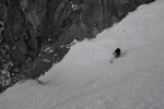 When Dave suggested this line I instantly became nervous. Even though I knew it was in good condition I had never skied anything this steep or this big before. With a toponeige grade of 5.4/5.5 E3 it is at the very upper end of skiable slopes. Known as one of the steepest sustained ice faces in the Alps it is not to be underestimated. I knew my ability could allow me to make turns on 50/55 degree slopes for short sections, usually cruxes on easier routes. This face would require me to make these controlled turns for over 700m of descent.
