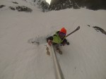 The first 100m was east facing and had a slight sun crust but still skied well. After the traverse back to the shady face the snow improved and so did the skiing. Making powder turns on 50+ degree slopes was a great feeling. Being in control and at the same time feeling madly out of control due to the location of the skiing, surrounded by towering faces and steep ice slopes.